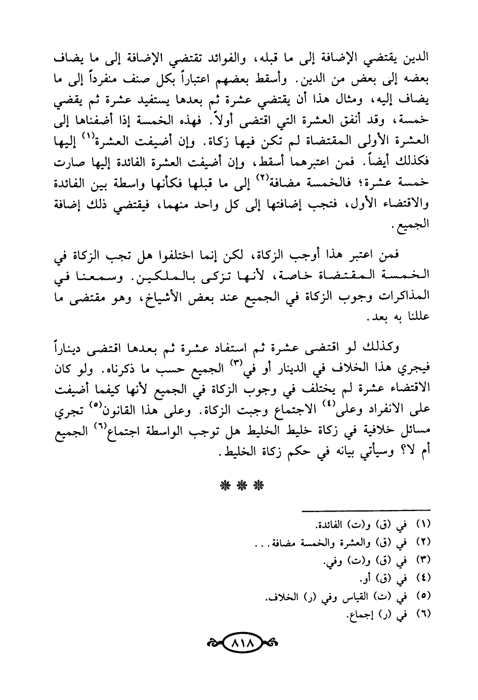 وكذلك لو اقتضى عشرة ثم استفاد عشرة ثم بعدها اقتضى دينارًا فيجري هذا الخلاف في الدينار أو في (¬3) الجميع حسب ما ذكرناه. ولو كان الاقتضاء عشرة لم يختلف في وجوب الزكاة في الجميع لأنها كيفما أضيفت على الانفراد وعلى (¬4) الاجتماع وجبت الزكاة. وعلى هذا القانون (¬5) تجري مسائل خلافية في زكاة خليط الخليط هل توجب الواسطة اجتماع (¬6) الجميع أم لا؟ وسيأتي بيانه في حكم زكاة الخليط.