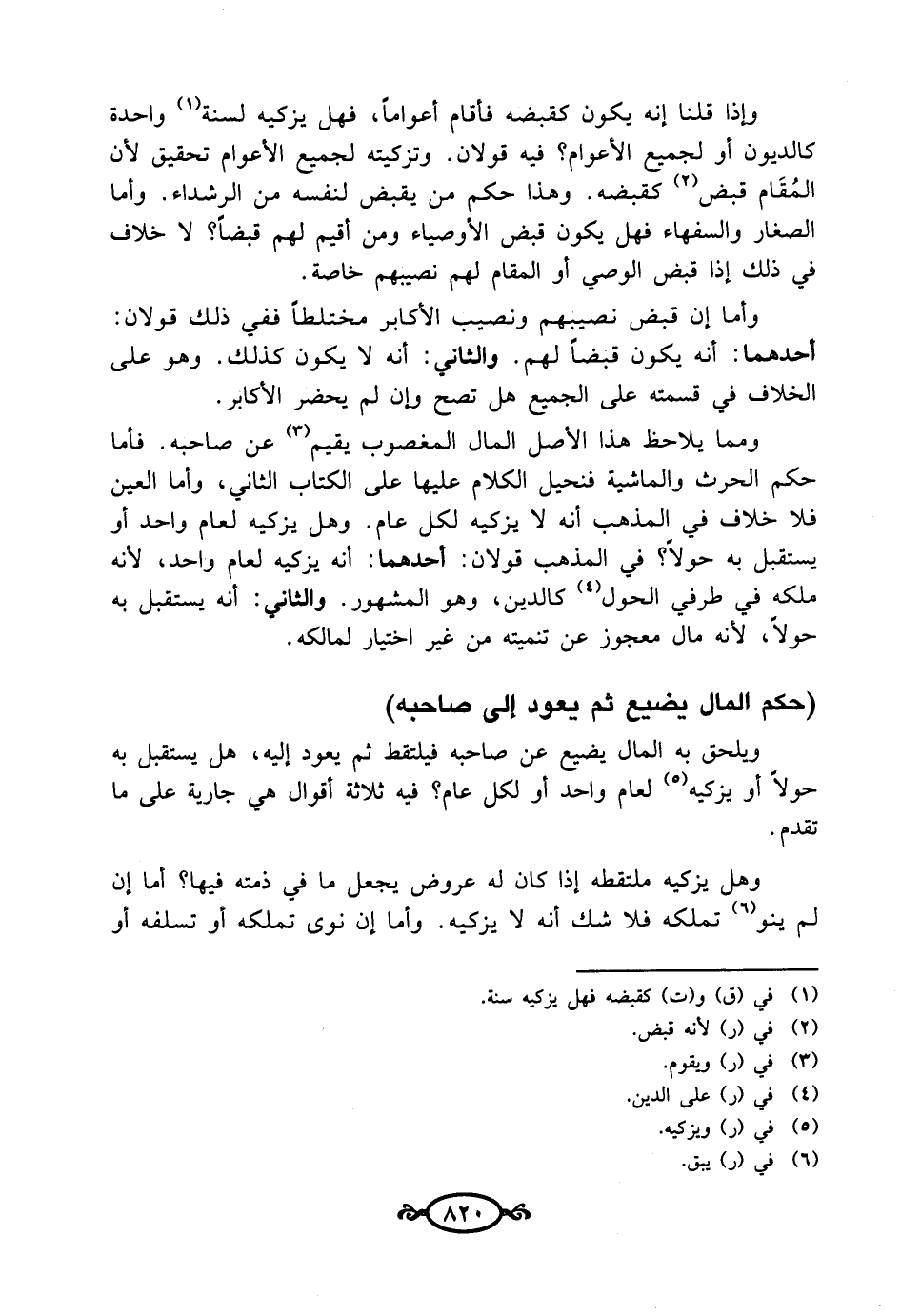 ومما يلاحظ هذا الأصل المال المغصوب يقيم (¬3) عن صاحبه. فأما حكم الحرث والماشية فنحيل الكلام عليها على الكتاب الثاني، وأما العين فلا خلاف في المذهب أنه لا يزكيه لكل عام. وهل يزكيه لعام واحد أو يستقبل به حولًا؟ في المذهب قولان: أحدهما: أنه يزكيه لعام واحد, لأنه ملكه في طرفي الحول (¬4) كالدين، وهو المشهور. والثاني: أنه يستقبل به حولًا, لأنه مال معجوز عن تنميته من غير اختيار لمالكه.