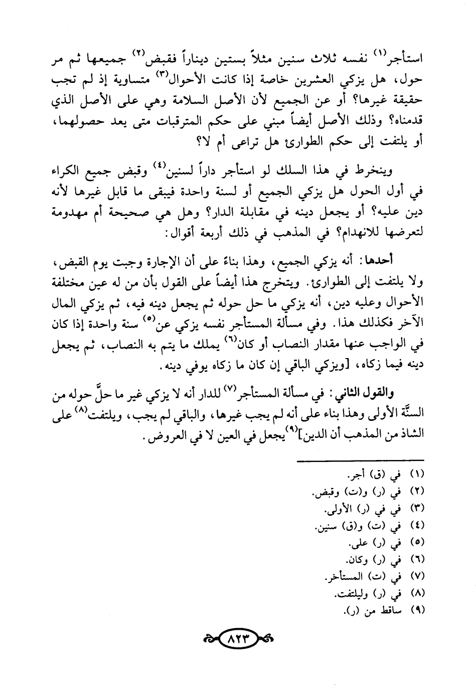 والقول الثاني: في مسألة المستأجر (¬7) للدار أنه لا يزكي غير ما حلَّ حوله من السنَّة الأولى وهذا بناء على أنه لم يجب غيرها، والباقي لم يجب، ويلتفت (¬8) على الشاذ من المذهب أن الدين] (¬9) يجعل في العين لا في العروض.