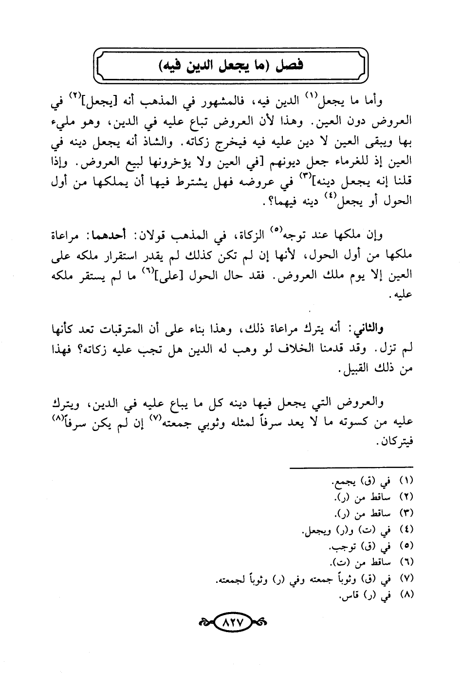 وأما ما يجعل (¬1) الدين فيه، فالمشهور في المذهب أنه [يجعل] (¬2) في العروض دون العين. وهذا لأن العروض تباع عليه في الدين، وهو مليء بها ويبقى العين لا دين عليه فيه فيخرج زكاته. والشاذ أنه يجعل دينه في العين إذ للغرماء جعل ديونهم [في العين ولا يؤخرونها لبيع العروض. وإذا قلنا إنه يجعل دينه] (¬3) في عروضه فهل يشترط فيها أن يملكها من أول الحول أو يجعل (¬4) دينه فيهما؟.