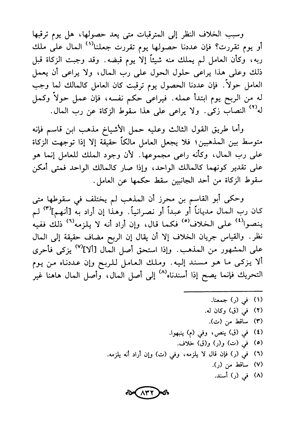 وسبب الخلاف النظر إلى المترقبات متى يعد حصولها، هل يوم ترقبها أو يوم تقررت؟ فإن عددنا حصولها يوم تقررت جعلنا (¬1) المال على ملك ربه، وكأن العامل لم يملك منه شيئًا إلا يوم قبضه. وقد وجبت الزكاة قبل ذلك وعلى هذا يراعى حلول الحول على رب المال، ولا يراعى أن يعمل العامل حولًا. فإن عددنا الحصول يوم ترقبت كان العامل كالمالك لما وجب له من الربح يوم ابتدأ عمله. فيراعى حكم نفسه، فإن عمل حولًا وكمل له (¬2) النصاب زكى. ولا يراعى على هذا سقوط الزكاة عن رب المال.