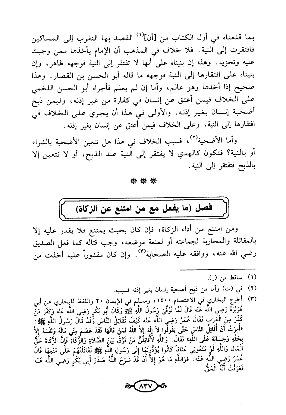 (¬3) أخرج البخارىِ في الاعتصام 1400، ومسلم في الإيمان 20 واللفظ للبخاري عن أبي هُرَيْرَةَ رَضِي الله عَنْه قَالَ لَمَّا تُوُفيَ رَسُولُ الله - صلى الله عليه وسلم - وَكَانَ أَبُو بَكْرِ رَضِي الله عَنْه وَكَفَرَ مَنْ كَفَرَ مِنَ الْعَرَب فَقَالَ عُمَرُ رَضِي الله عَنْه كَيفَ تُقَاتِلُ النَّاسَ وَقَد قالَ رَسُولُ - صلى الله عليه وسلم -: "أُمرُتُ أَن أُقاتِلَ النَّاسَ حتَّى يَقُولوا لاَ إلَهَ إلاَّ الله فَمَن قالَها فقد عَصَمَ مِنِّي مَالَهُ وَنَفْسَهُ إلَّا بحَقهِ وَحِسَابُهُ عَلَى الله" فَقَالَ: وَاللهِ لأُقَاتِلَنَّ مَنْ فرق بَينَ الصَّلاةِ وَالزكَاةِ فَإِنَ الزَكَاةَ حَق المْالِ وَالله لَوْ مَنَعُونِي عَنَاقاً كَانُوا يُؤَدُّونَهَا إِلَى رَسُولِ اللهِ - صلى الله عليه وسلم - لَقَاتَلتُهُم عَلَى مَنعِهَا قَالَ عُمَرُ رَضِي الله عَنْه: فَوَاللَّه مَا هُوَ إِلا أَنْ قَدْ شَرَحَ الله صَدْرَ أبِي بَكْرٍ رَضِى الله عَنْه فَعَرَفْتُ أَنَّهُ الحَقُّ.