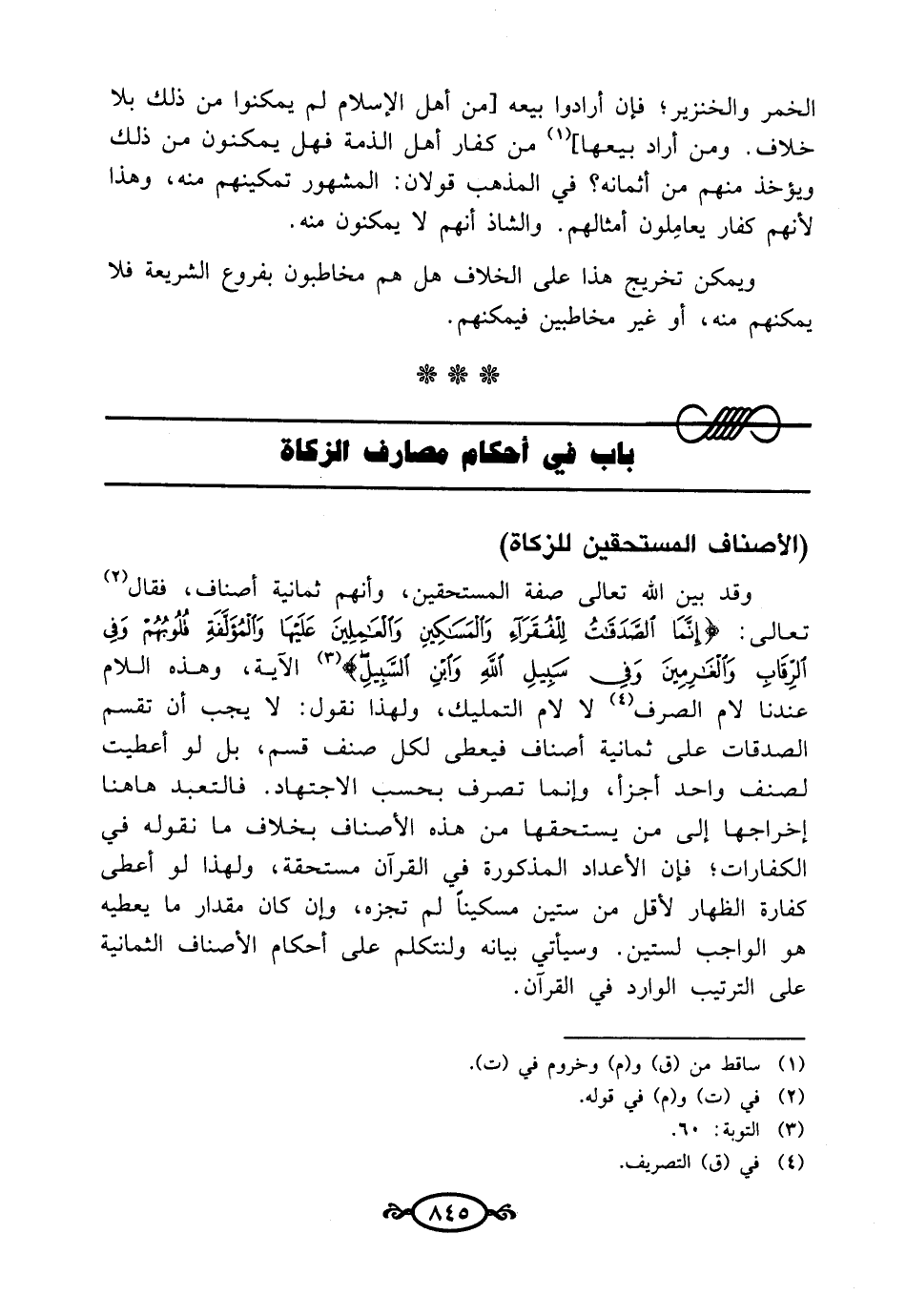 وقد بين الله تعالى صفة المستحقين، وأنهم ثمانية أصناف، فقال (¬2) تعالى: {إِنَّمَا الصَّدَقَاتُ لِلْفُقَرَاءِ وَالْمَسَاكِينِ وَالْعَامِلِينَ عَلَيْهَا وَالْمُؤَلَّفَةِ قُلُوبُهُمْ وَفِي الرِّقَابِ وَالْغَارِمِينَ وَفِي سَبِيلِ اللَّهِ وَابْنِ السَّبِيلِ} (¬3) الآية، وهذه اللام عندنا لام الصرف (¬4) لا لام التمليك، ولهذا نقول: لا يجب أن تقسم الصدقات على ثمانية أصناف فيعطى لكل صنف قسم، بل لو أعطيت لصنف واحد أجزأ، وإنما تصرف بحسب الاجتهاد. فالتعبد هاهنا إخراجها إلى من يستحقها من هذه الأصناف بخلاف ما نقوله في الكفارات؛ فإن الأعداد المذكورة في القرآن مستحقة، ولهذا لو أعطى كفارة الظهار لأقل من ستين مسكينًا لم تجزه، وإن كان مقدار ما يعطيه هو الواجب لستين. وسيأتي بيانه ولنتكلم على أحكام الأصناف الثمانية على الترتيب الوارد في القرآن.