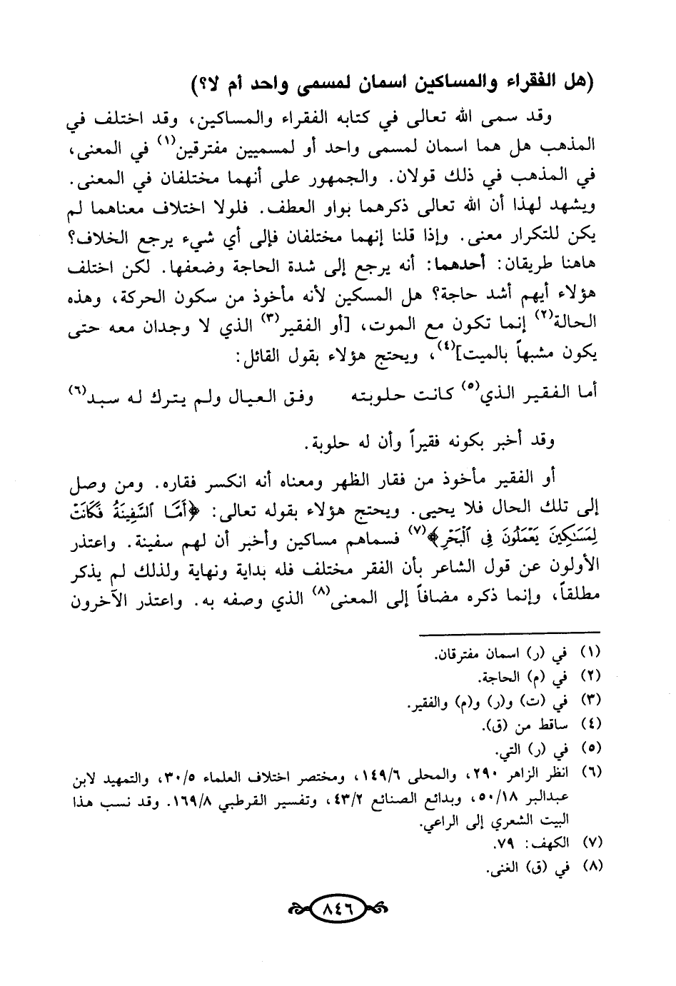 أو الفقير مأخوذ من فقار الظهر ومعناه أنه انكسر فقاره. ومن وصل إلى تلك الحال فلا يحيى. ويحتج هؤلاء بقوله تعالى: {أَمَّا السَّفِينَةُ فَكَانَتْ لِمَسَاكِينَ يَعْمَلُونَ فِي الْبَحْرِ} (¬7) فسماهم مساكين وأخبر أن لهم سفينة. واعتذر الأولون عن قول الشاعر بأن الفقر مختلف فله بداية ونهاية ولذلك لم يذكر مطلقًا، وإنما ذكره مضافًا إلى المعنى (¬8) الذي وصفه به. واعتذر الآخرون