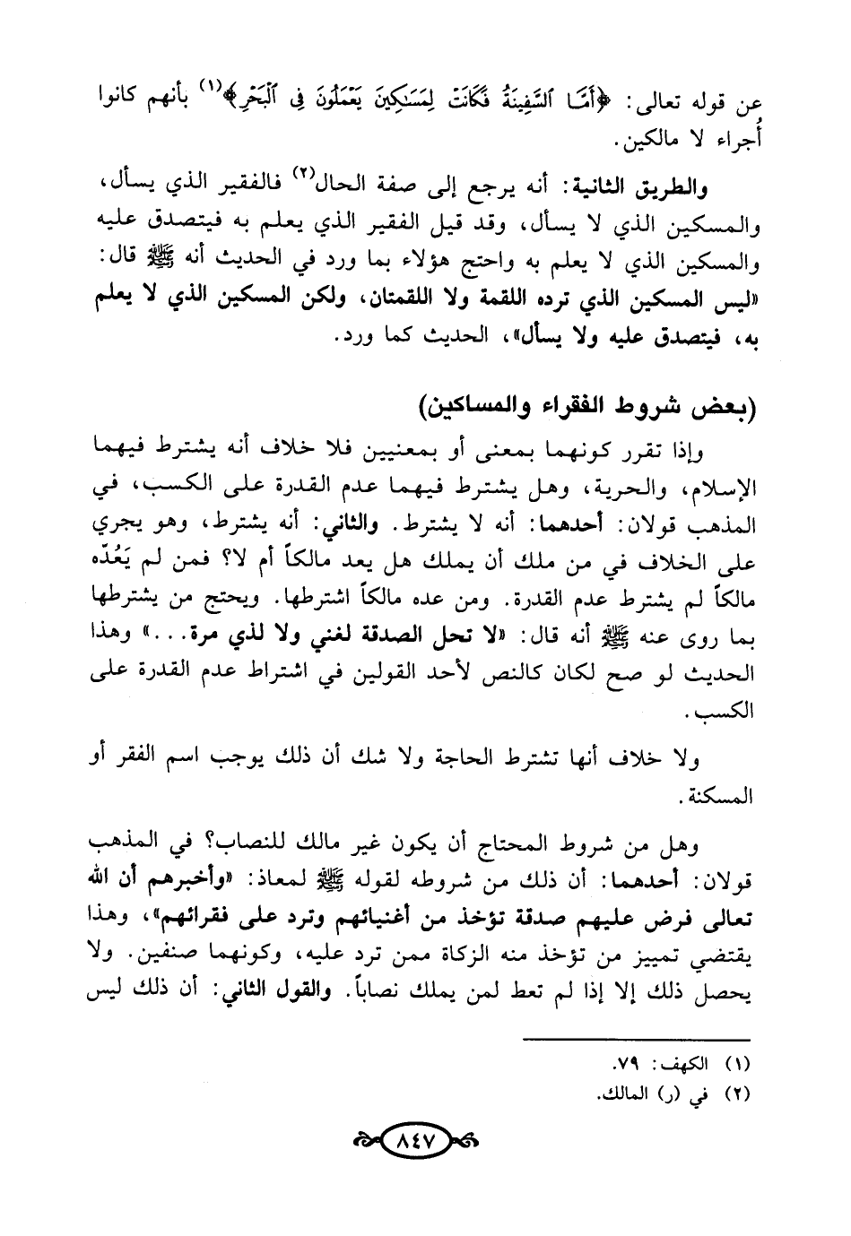 والطريق الثانية: أنه يرجع إلى صفة الحال (¬2) فالفقير الذي يسأل، والمسكين الذي لا يسأل، وقد قيل الفقير الذي يعلم به فيتصدق عليه والمسكين الذي لا يعلم به واحتج هؤلاء بما ورد في الحديث أنه - صلى الله عليه وسلم - قال: "ليس المسكين الذي ترده اللقمة ولا اللقمتان، ولكن المسكين الذي لا يعلم به، فيتصدق عليه ولا يسأل"، الحديث كما ورد.