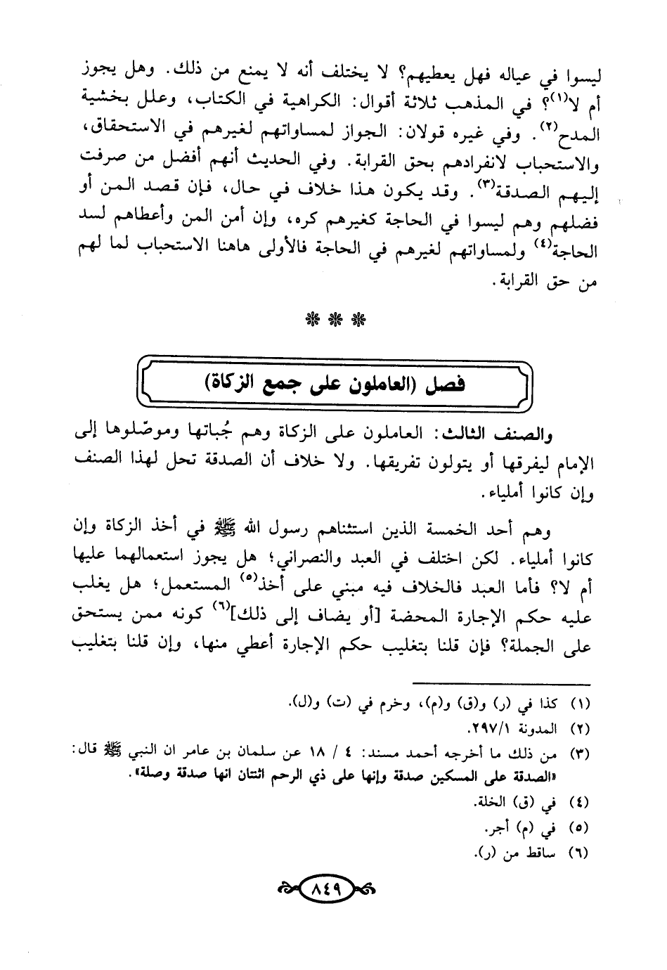 والصنف الثالث: العاملون على الزكاة وهم جُباتها وموصّلوها إلى الإمام ليفرقها أو يتولون تفريقها. ولا خلاف أن الصدقة تحل لهذا الصنف وإن كانوا أملياء.