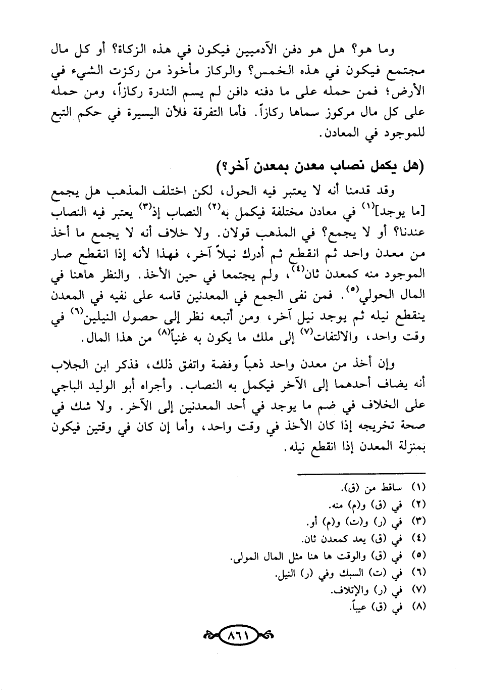 وقد قدمنا أنه لا يعتبر فيه الحول، لكن اختلف المذهب هل يجمع [ما يوجد] (¬1) في معادن مختلفة فيكمل به (¬2) النصاب إذ (¬3) يعتبر فيه النصاب عندنا؟ أو لا يجمع؟ في المذهب قولان. ولا خلاف أنه لا يجمع ما أخذ من معدن واحد ثم انقطع ثم أدرك نيلاً آخر، فهذا لأنه إذا انقطع صار الموجود منه كمعدن ثان (¬4)، ولم يجتمعا في حين الأخذ. والنظر هاهنا في المال الحولي (¬5). فمن نفى الجمع في المعدنين قاسه على نفيه في المعدن ينقطع نيله ثم يوجد نيل آخر، ومن أتبعه نظر إلى حصول النيلين (¬6) في وقت واحد، والالتفات (¬7) إلى ملك ما يكون به غنيًا (¬8) من هذا المال.