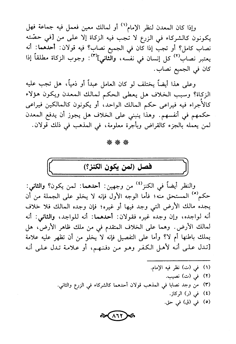 وإذا كان المعدن لنظر الإمام (¬1) أو لمالك معين فعمل فيه جماعة فهل يكونون كالشركاء في الزرع لا تجب فيه الزكاة إلا على من [في حصّته نصاب كامل؟ أو تجب إذا كان في الجميع نصاب؟ فيه قولان: أحدهما: أنه يعتبر نصاب (¬2) كل إنسان في نفسه، والثاني] (¬3): وجوب الزكاة مطلقًا إذا كان في الجميع نصاب.