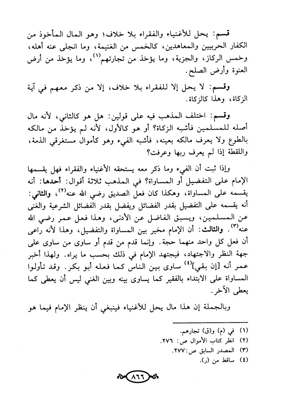 وإذا ثبت أن الفيء وما ذكر معه يستحقه الأغنياء والفقراء فهل يقسمها الإمام على التفضيل أو المساواة, في المذهب ثلاثة أقوال: أحدها: أنه يقسمه على المساواة، وهكذا كان فعل الصديق رضي الله عنه (¬2)، والثاني: أنه يقسمه على التفضيل بقدر الفضائل ويفضل بقدر الفضائل الشرعية والغنى عن المسلمين، ويسبق الفاضل عن الأدنى، وهذا فعل عمر رضي الله عنه (¬3). والثالث: أن الإمام مخير بين المساواة والتفضيل، وهذا لأنه راعى أن فعل كل واحد منهما حجة. وإنما قدم من قدم أو ساوى من ساوى على جهة النظر والاجتهاد، فيجتهد الإمام في ذلك بحسب ما يراه. ولهذا أخبر عمر أنه [إن بقي] (¬4) ساوى بين الناس كما فعله أبو بكر. وقد تأولوا المساواة على الابتداء بالفقير كما يساوى بينه وبين الغني ليس أن يعطى كما يعطى الآخر.