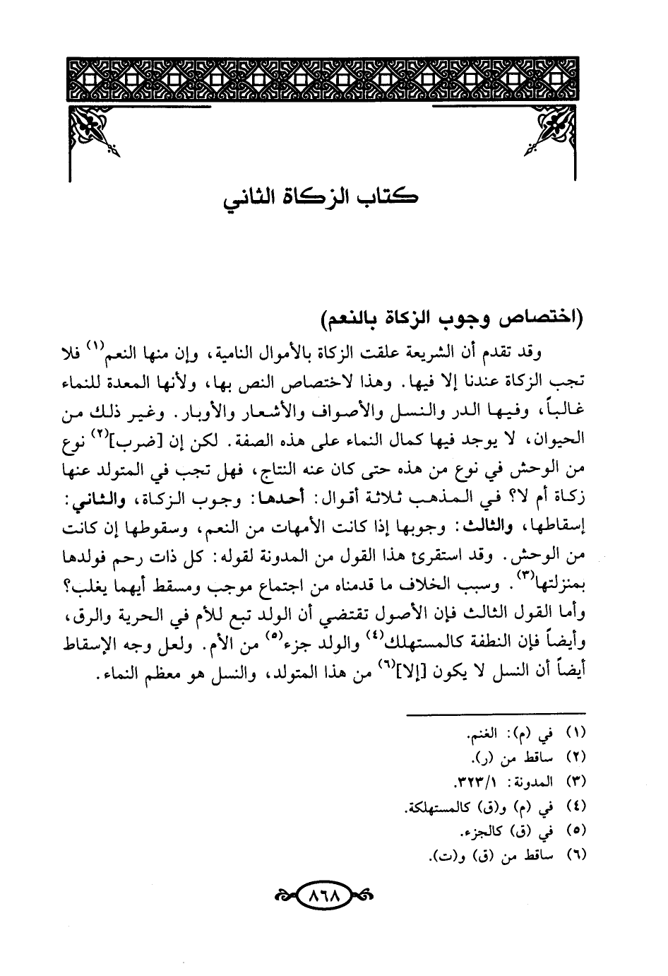 وقد تقدم أن الشريعة علقت الزكاة بالأموال النامية، وإن منها النعم (¬1) فلا تجب الزكاة عندنا إلا فيها. وهذا لاختصاص النص بها، ولأنها المعدة للنماء غالباً، وفيها الدر والنسل والأصواف والأشعار والأوبار. وغير ذلك من الحيوان، لا يوجد فيها كمال النماء على هذه الصفة. لكن إن [ضرب] (¬2) نوع من الوحش في نوع من هذه حتى كان عنه النتاج، فهل تجب في المتولد عنها زكاة أم لا؟ في المذهب ثلاثة أقوال: أحدها: وجوب الزكاة، والثاني: إسقاطها، والثالث: وجوبها إذا كانت الأمهات من النعم، وسقوطها إن كانت من الوحش. وقد استقرئ هذا القول من المدونة لقوله: كل ذات رحم فولدها بمنزلتها (¬3). وسبب الخلاف ما قدمناه من اجتماع موجب ومسقط أيهما يغلب؟ وأما القول الثالث فإن الأصول تقتضي أن الولد تبع للأم في الحرية والرق، وأيضًا فإن النطفة كالمستهلك (¬4) والولد جزء (¬5) من الأم. ولعل وجه الإسقاط أيضًا أن النسل لا يكون [إلا] (¬6) من هذا المتولد، والنسل هو معظم النماء.