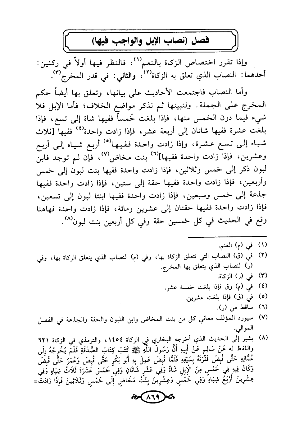 (¬8) يشير إلى الحديث الذي أخرجه البخاري في الزكاة 1454، والترمذي في الزكاة 621 واللفظ له عَنْ سَالِم عَنْ أَبِيهِ أَن رَسُولَ اللهِ - صلى الله عليه وسلم - كَتَبَ كِتَابَ الصدقَةِ فَلَمْ يُخْرِجهُ إِلَى عُمَّالِهِ حَتَّى قُبِضَ فَقرَنَهُ بِسَيفِهِ فَلَمَّا قُبِضَ عَمِلَ بِهِ أَبو بَكْر حَتَّى قُبِضَ وَعُمَرُ حَتَّى قُبِضَ وَكَانَ فِيهِ في خَمّسٍ مِنَ الْإِبِلِ شَاةٌ: وَفِي عَشْرِ شَاتَانِ وَفِي خَمْسَ عَشَرَةَ ثَلَاثُ شِيَاه وَفِي عِشرِينَ أَرْبَعُ شِيَاهِ وَفِي خَمّسٍ وَعِشْرِينَ بِنتُ مَخَاضٍ إِلَى خَمّسٍ وَثَلَاثِينَ فَإِذَا زَادَتْ =
