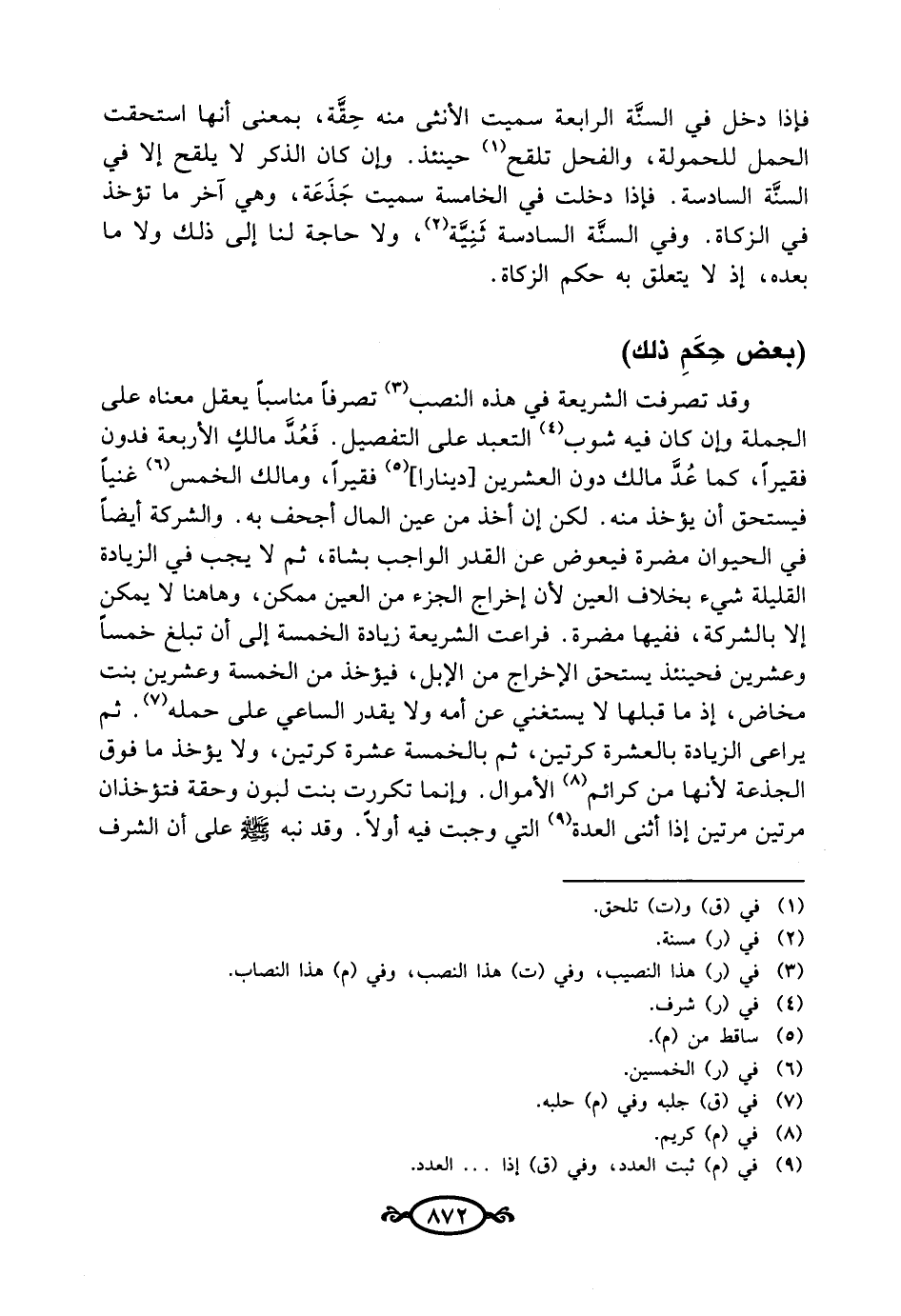 وقد تصرفت الشريعة في هذه النصب (¬3) تصرفًا مناسبًا يعقل معناه على الجملة وإن كان فيه شوب (¬4) التعبد على التفصيل. فَعُدَّ مالكِ الأربعة فدون فقيرًا، كما عُدَّ مالك دون العشرين [دينارا] (¬5) فقيرًا، ومالك الخمس (¬6) غنيًا فيستحق أن يؤخذ منه. لكن إن أخذ من عين المال أجحف به. والشركة أيضًا في الحيوان مضرة فيعوض عن القدر الواجب بشاة، ثم لا يجب في الزيادة القليلة شيء بخلاف العين لأنّ إخراج الجزء من العين ممكن، وهاهنا لا يمكن إلا بالشركة، ففيها مضرة. فراعت الشريعة زيادة الخمسة إلى أن تبلغ خمسًا وعشرين فحينئذ يستحق الإخراج من الإبل، فيؤخذ من الخمسة وعشرين بنت مخاض، إذ ما قبلها لا يستغني عن أمه ولا يقدر الساعي على حمله (¬7). ثم يراعى الزيادة بالعشرة كرتين، ثم بالخمسة عشرة كرتين، ولا يؤخذ ما فوق الجذعة لأنها من كرائم (¬8) الأموال. وإنما تكررت بنت لبون وحقة فتؤخذان مرتين مرتين إذا أثنى العدة (¬9) التي وجبت فيه أولًا. وقد نبه - صلى الله عليه وسلم - على أن الشرف