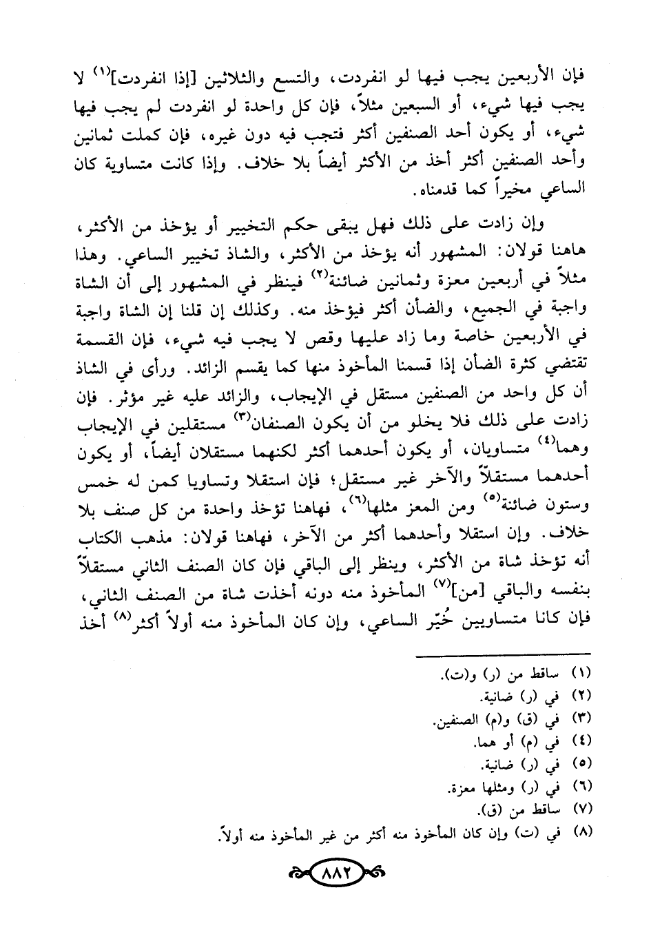وإن زادت على ذلك فهل يبقى حكم التخيير أو يؤخذ من الأكثر، هاهنا قولان: المشهور أنه يؤخذ من الأكثر، والشاذ تخيير الساعي. وهذا مثلًا في أربعين معزة وثمانين ضائنة (¬2) فينظر في المشهور إلى أن الشاة واجبة في الجميع، والضأن أكثر فيؤخذ منه. وكذلك إن قلنا إن الشاة واجبة في الأربعين خاصة وما زاد عليها وقص لا يجب فيه شيء، فإن القسمة تقتضي كثرة الضأن إذا قسمنا المأخوذ منها كما يقسم الزائد. ورأى في الشاذ أن كل واحد من الصنفين مستقل في الإيجاب، والزائد عليه غير مؤثر. فإن زادت على ذلك فلا يخلو من أن يكون الصنفان (¬3) مستقلين في الإيجاب وهما (¬4) متساويان، أو يكون أحدهما أكثر لكنهما مستقلان أيضًا، أو يكون أحدهما مستقلاً والآخر غير مستقل؛ فإن استقلا وتساويا كمن له خمس وستون ضائنة (¬5) ومن المعز مثلها (¬6)، فهاهنا تؤخذ واحدة من كل صنف بلا خلاف. وإن استقلا وأحدهما أكثر من الآخر، فهاهنا قولان: مذهب الكتاب أنه تؤخذ شاة من الأكثر، وينظر إلى الباقي فإن كان الصنف الثاني مستقلاً بنفسه والباقي [من] (¬7) المأخوذ منه دونه أخذت شاة من الصنف الثاني، فإن كانا متساويين خُير الساعي، وإن كان المأخوذ منه أولًا أكثر (¬8) أخذ