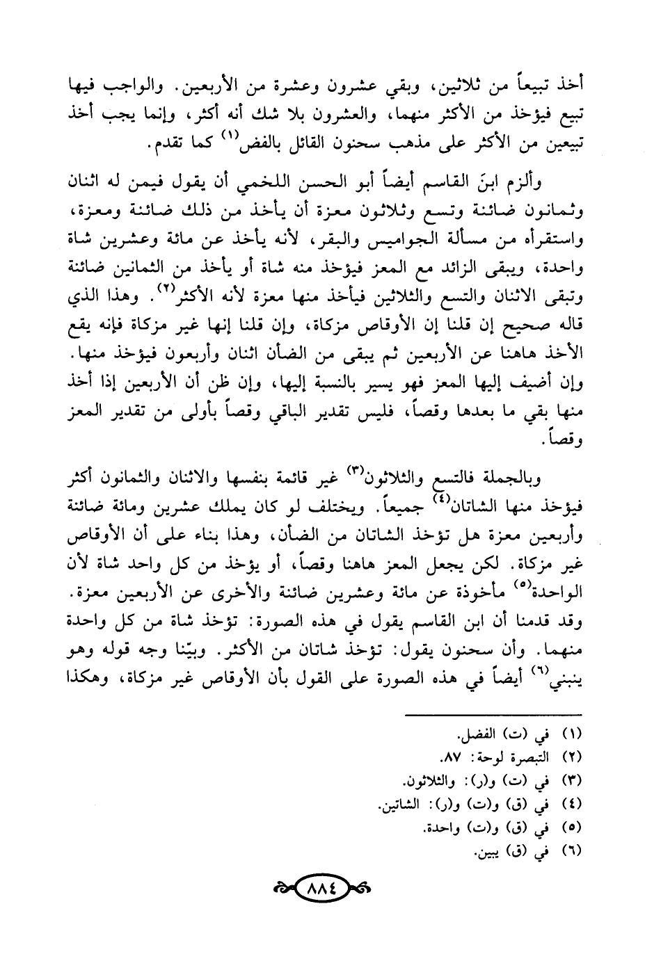 وألزم ابنَ القاسم أيضًا أبو الحسن اللخمي أن يقول فيمن له اثنان وثمانون ضائنة وتسع وثلاثون معزة أن يأخذ من ذلك ضائنة ومعزة، واستقرأه من مسألة الجواميس والبقر, لأنه يأخذ عن مائة وعشرين شاة واحدة، ويبقى الزائد مع المعز فيؤخذ منه شاة أو يأخذ من الثمانين ضائنة وتبقى الاثنان والتسع والثلاثين فيأخذ منها معزة لأنه الأكثر (¬2). وهذا الذي قاله صحيح إن قلنا إن الأوقاص مزكاة، وإن قلنا إنها غير مزكاة فإنه يقع الأخذ هاهنا عن الأربعين ثم يبقى من الضأن اثنان وأربعون فيؤخذ منها. وإن أضيف إليها المعز فهو يسير بالنسبة إليها، وإن ظن أن الأربعين إذا أخذ منها بقي ما بعدها وقصًا، فليس تقدير الباقي وقصًا بأولى من تقدير المعز وقصًا.
