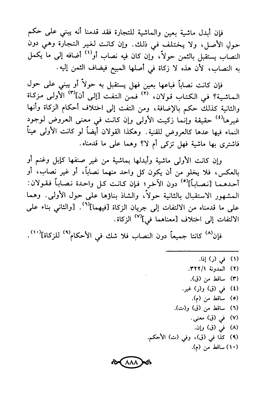 وإن كانت الأولى ماشية وأبدلها بماشية من غير صنفها كإبل وغنم أو بالعكس، فلا يخلو من أن يكون كل واحد منهما نصابًا، أو غير نصاب، أو أحدهما [نصابًا] (¬5) دون الآخر؛ فإن كانت كل واحدة نصابًا فقولان: المشهور الاستقبال بالثانية حولًا، والشاذ بناؤها على حول الأولى. وهما على ما قدمناه من الالتفات إلى جريان الزكاة [فيهما] (¬6). [والثاني بناء على الالتفات إلى اختلاف [معناهما في] (¬7) الزكاة.