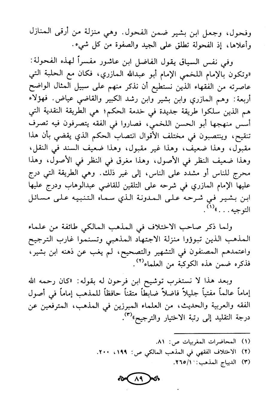 وفي نفس السياق يقول الفاضل ابن عاشور مفسرًا لهذه الفحولة: "وتكون بالإمام اللخمي الإمام أبو عبد الله المازري، فكان مع الحلبة التي عاصرته من الفقهاء الذين نستطيع أن نذكر منهم على سبيل المثال الواضح أربعة: وهم المازري وابن بشير وابن رشد الكبير والقاضي عياض. فهؤلاء هم الذين سلكوا طريقة جديدة في خدمة الحكم؛ هي الطريقة النقدية التي أسس منهجها أبو الحسن اللخمي، فصاروا في الفقه يتصرفون فيه تصرف تنقيح، وينتصبون في مختلف الأقوال انتصاب الحكم الذي يقضي بأن هذا مقبول، وهذا ضعيف، وهذا غير مقبول، وهذا ضعيف السند في النقل، وهذا ضعيف النظر في الأصول، وهذا مغرق في النظر في الأصول، وهذا محرج للناس أو مشدد على الناس، إلى غير ذلك. وهي الطريقة التي درج عليها الإمام المازري في شرحه على التلقين للقاضي عبد الوهاب ودرج عليها ابن بشير في شرحه على المدونة الذي سماه التنبيه على مسائل التوجيه ... " (¬1).