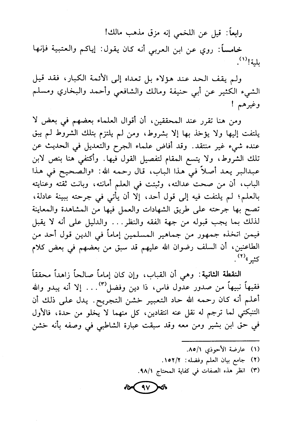 ومن هنا تقرر عند المحققين، أن أقوال العلماء بعضهم في بعض لا يلتفت إليها ولا يؤخذ بها إلا بشروط، ومن لم يلتزم بتلك الشروط لم يبق عنده شيء غير منتقد. وقد أفاض علماء الجرح والتعديل في الحديث عن تلك الشروط، ولا يتسع المقام لتفصيل القول فيها. وأكتفي هنا بنص لابن عبد البر يعد أصلًا في هذا الباب، قال رحمه الله: "والصحيح في هذا الباب، أن من صحت عدالته، وثبتت في العلم أمانته، وبانت ثقته وعنايته بالعلم؛ لم يلتفت فيه إلى قول أحد، إلا أن يأتي في جرحته ببينة عادلة، تصح بها جرحته على طريق الشهادات والعمل فيها من المشاهدة والمعاينة لذلك بما يجب قبوله من جهة الفقه والنظر ... والدليل على أنه لا يقبل فيمن اتخذه جمهور من جماهير المسلمين إمامًا في الدين قول أحد من الطاعنين، أن السلف رضوان الله عليهم قد سبق من بعضهم في بعض كلام كثير" (¬2).