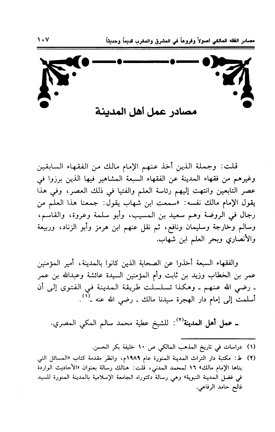 والفقهاء السبعة أخذوا عن الصحابة الذين كانوا بالمدينة، أمير المؤمنين عمر بن الخطاب وزيد بن ثابت وأم المؤمنين السيدة عائشة وعبد الله بن عمر ـ رضي الله عنهم ـ وهكذا تسلسلت طريقة المدينة في الفتوى إلى أن أسلمت إلى إمام دار الهجرة سيدنا مالك ـ رضي الله عنه ـ ".