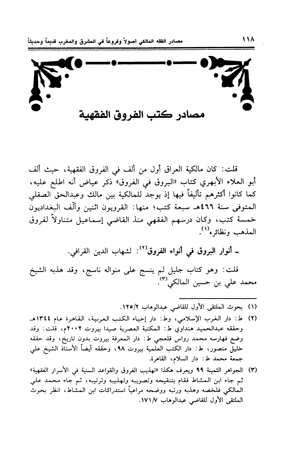 قلت: كان مالكية العراق أول من ألّف في الفروق الفقهية، حيث ألّف أبو العلاء الأبهري كتاب " البروق في الفروق " ذكر عياض أنه اطلع عليه، كما كانوا أكثرهم تأليفاً فيها إذ يوجد للمالكية بين مالك وعبد الحق الصقلي، المتوفي سنة 466هـ سبعة كتب، منها: القرويون اثنين وألّف البغداديون خمسة كتب، وكان درسهم الفقهي منذ القاضي إسماعيل متناولاً لفروق المذهب ونظائره.
