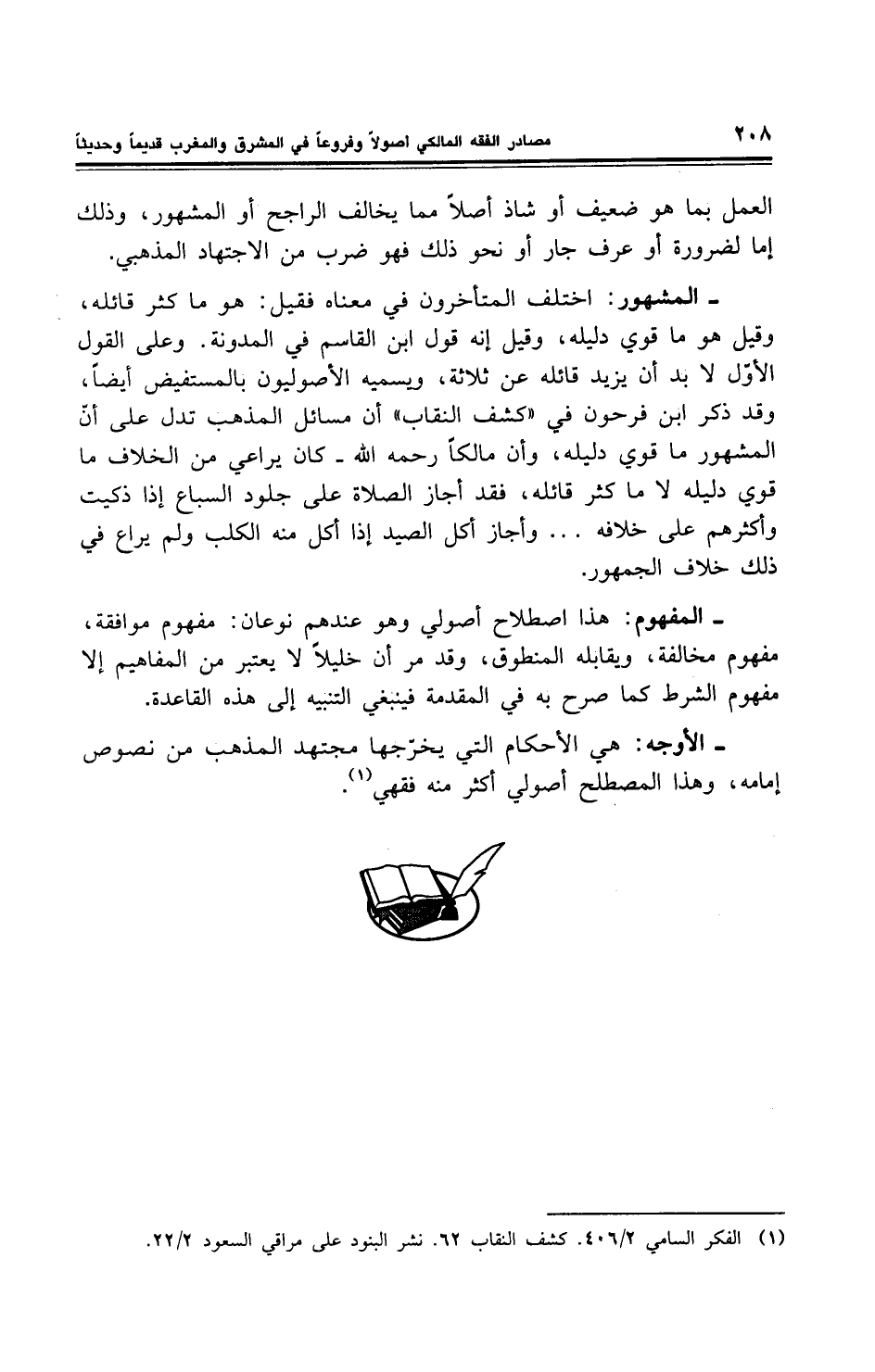 - المشهور: اختلف المتأخرون في معناه فقيل: هو ما كثر قائله، وقيل هو ما قوي دليله، وقيل إنه قول ابن القاسم في المدونة. وعلي القول الأوّل لابد أن يزيد قائله عن ثلاثة، ويسميه الأصوليون بالمستفيض أيضاً، وقد ذكر ابن فرحون في "كشف النقاب" أن مسائل المذهب تدل على أنّ المشهور ما قوي دليله، وأن مالكاً رحمه الله – كان يراعي من الخلاف ما قوي دليله لا ما كثر قائله، فقد أجاز الصلاة على جلود السباع إذا ذكيت وأكثرهم على خلافه ..... وأجاز أكل الصيد إذا أكل منه الكلب ولم يراع في ذلك خلاف الجمهور.