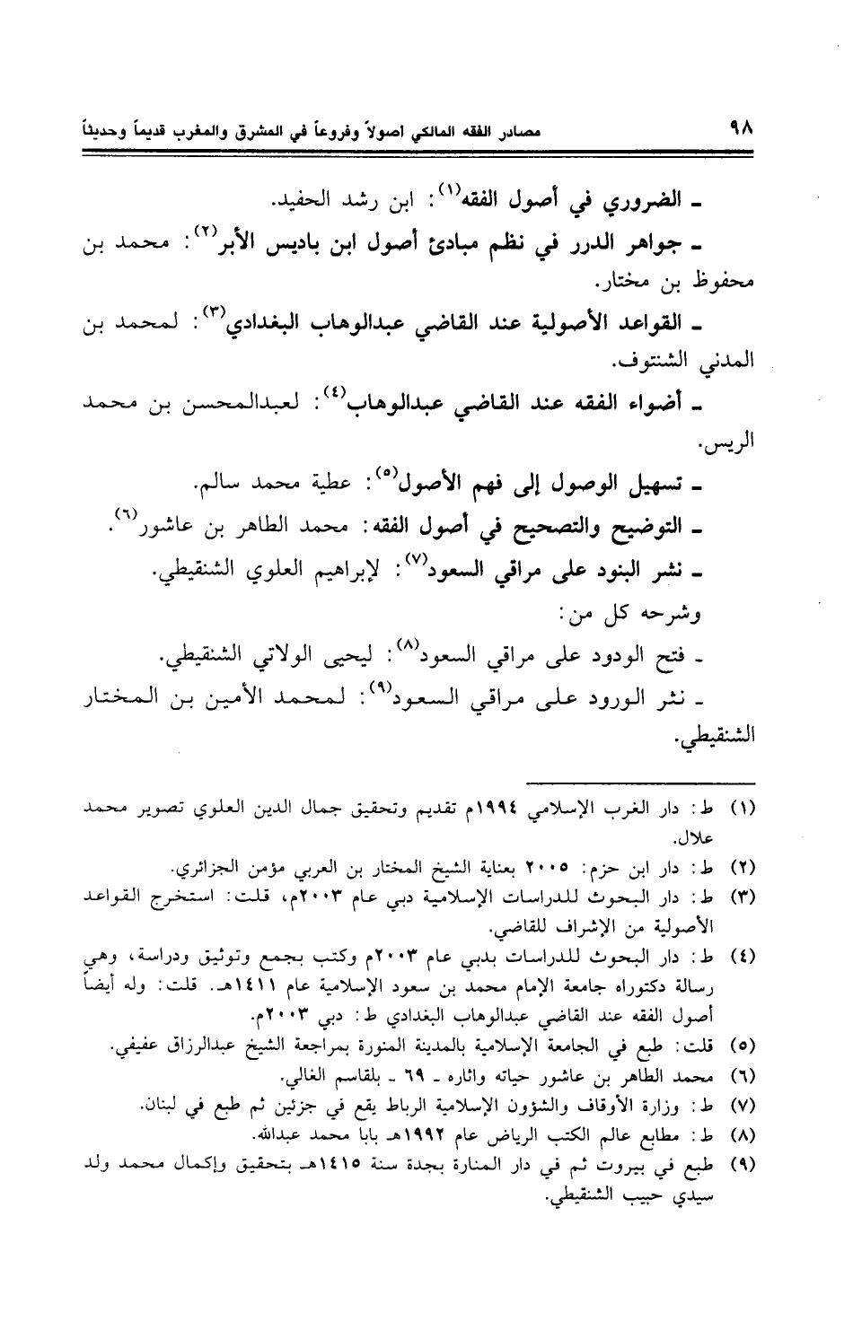 - القواعد الأصولية عبد القاضي عبد الوهاب البغدادي: لمحمد بن المدني الشنتوف.