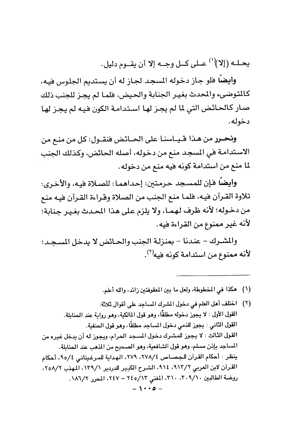 وتحرر من هذا قياسنا على الحائض فنقول: كل من منع من الاستدامة في المسجد منع من دخوله، أصله الحائض، وكذلك الجنب لما منع من استدامة كونه فيه منع من دخوله.
