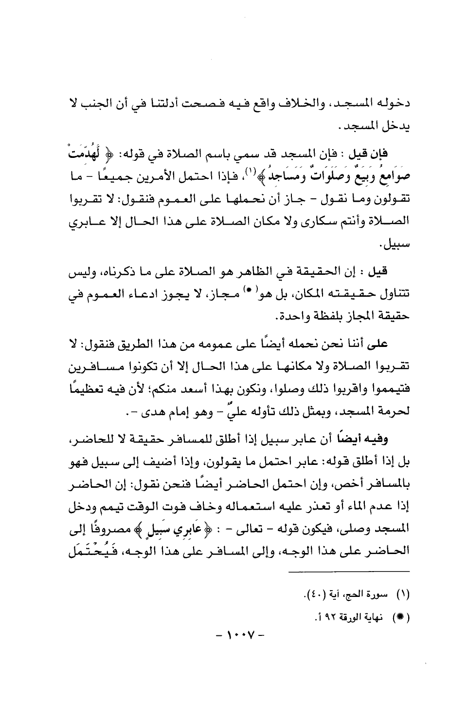 على أننا نحن نحمله أيضا على عمومه من هذا الطريق فنقول: لا تقربوا الصلاة ولا مكانها على هذا الحال إلا أن تكونوا مسافرين فتيمموا واقربوا ذلك وصلوا، ونكون بهذا أسعد منكم؛ لأن فيه تعظيما لحرمة المسجد، وبمثل ذلك تأوله علي - وهو إمام هدى -.