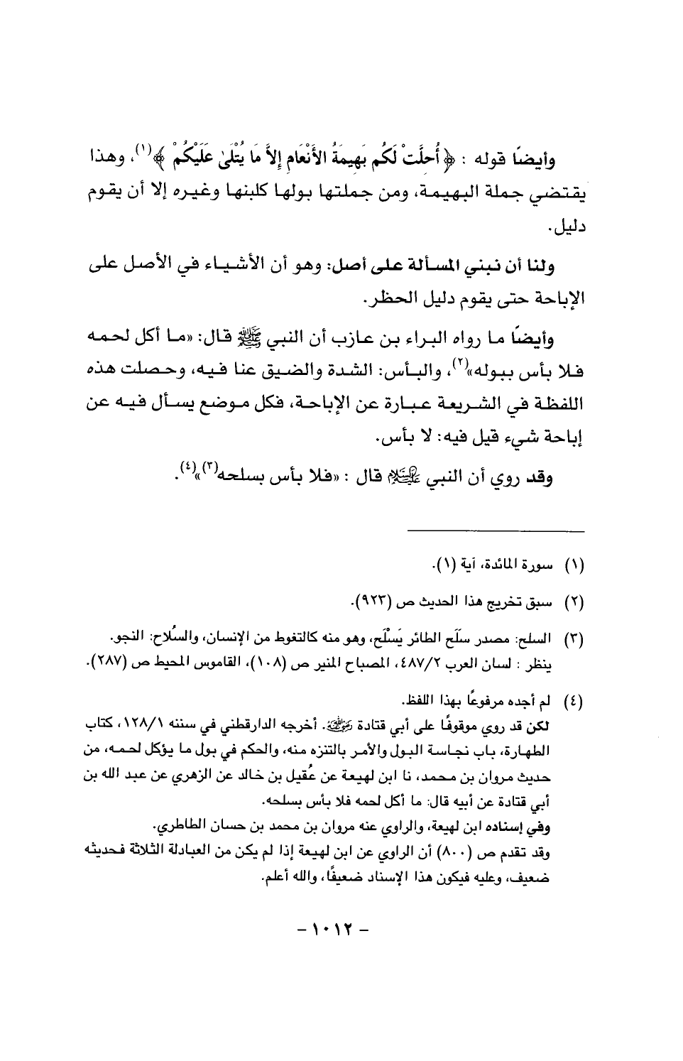 وأيضا ما رواه البراء بن عازب أن النبي صَلَّى اللَّهُ عَلَيْهِ وَسَلَّمَ قال: (ما أطكل لحمه فلا بأس ببوله)، والبأس: الشدة والضيق عندنا فيه، وحصلت هذه اللفظة في الشريعة عبارة عن الإباحة، فكل موضع يسأل فيه عن إباحة شيء قيل فيه: لا بأس.