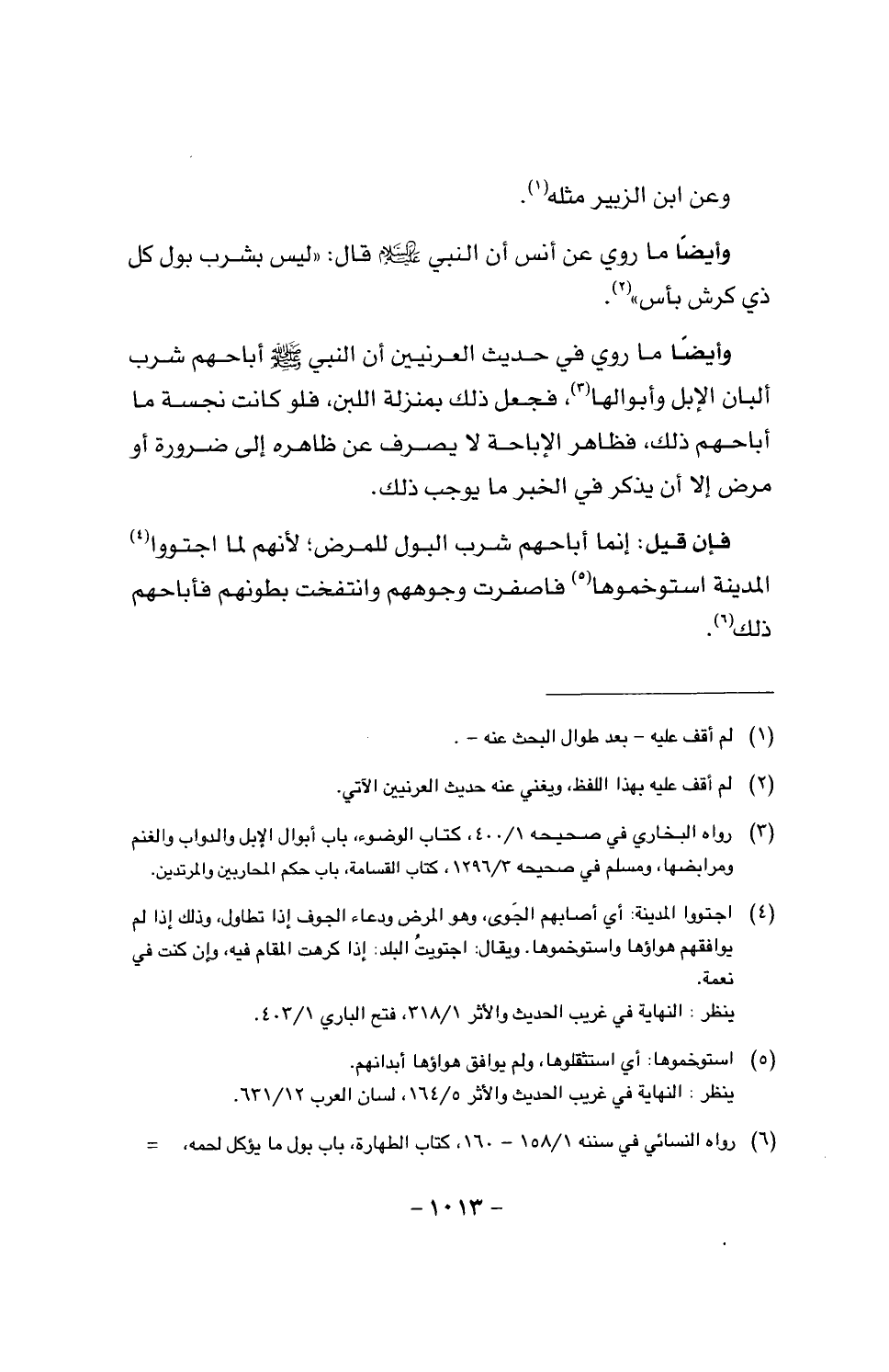وأيضا ما روي في حديث العرنيين أن النبي صَلَّى اللَّهُ عَلَيْهِ وَسَلَّمَ أباحهم شرب ألبان الإبل وأبوالها، فجعل ذلك بمنزلة اللبن، فلو كانت نجسة ما أباحهم ذلك، فظاهر الإباحة لا يصرف عن ظاهره إلى ضرورة أو مرض إلا أن يذكر في الخبر ما يوجب ذلك.