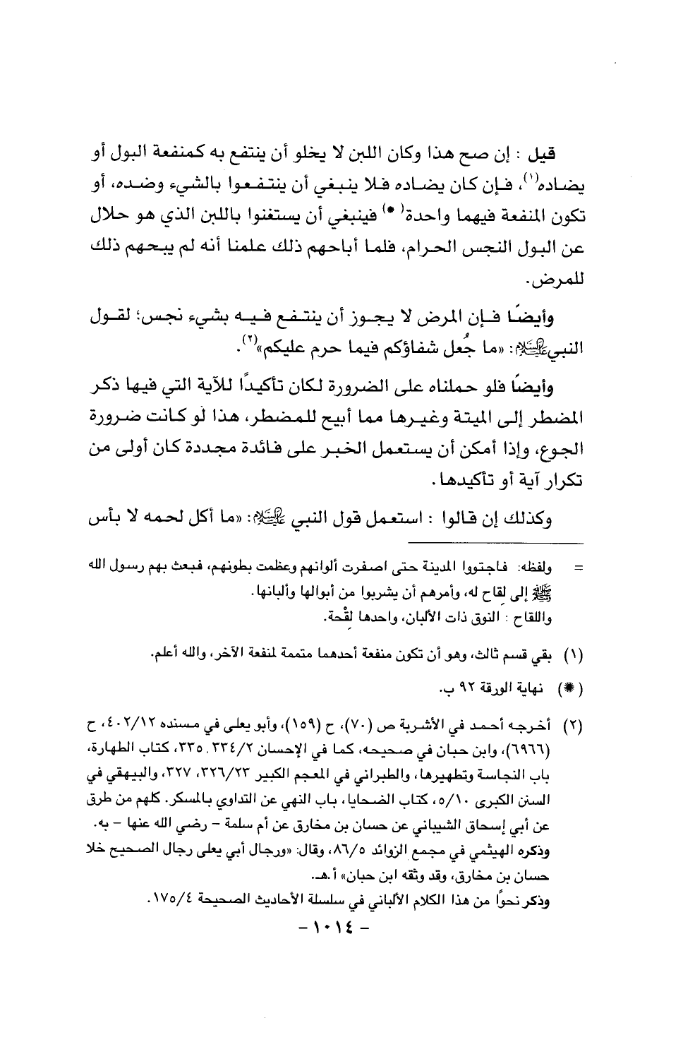 قيل: إن صح هذا وكان اللبن لا يخلو أن ينتفع به كمنفعة البول أو يضاده، فإن كان يضاده فلا ينبغي أن ينتفعوا بالشيء وضده، أو تكون المنفعة فيهما واحدة فينبغي أن يستغنوا اللبن الذي هو حلال عن البول النجس الحرام، فلما أباحهم ذلك علمنا أنه لم يبحهم ذلك للمرض.