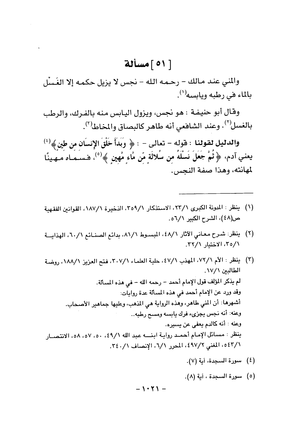 والمني عند مالك - رَحمَه الله - نجس لا يزيل حكمه إلا الغسل بالماء في رطبه ويابسه.
