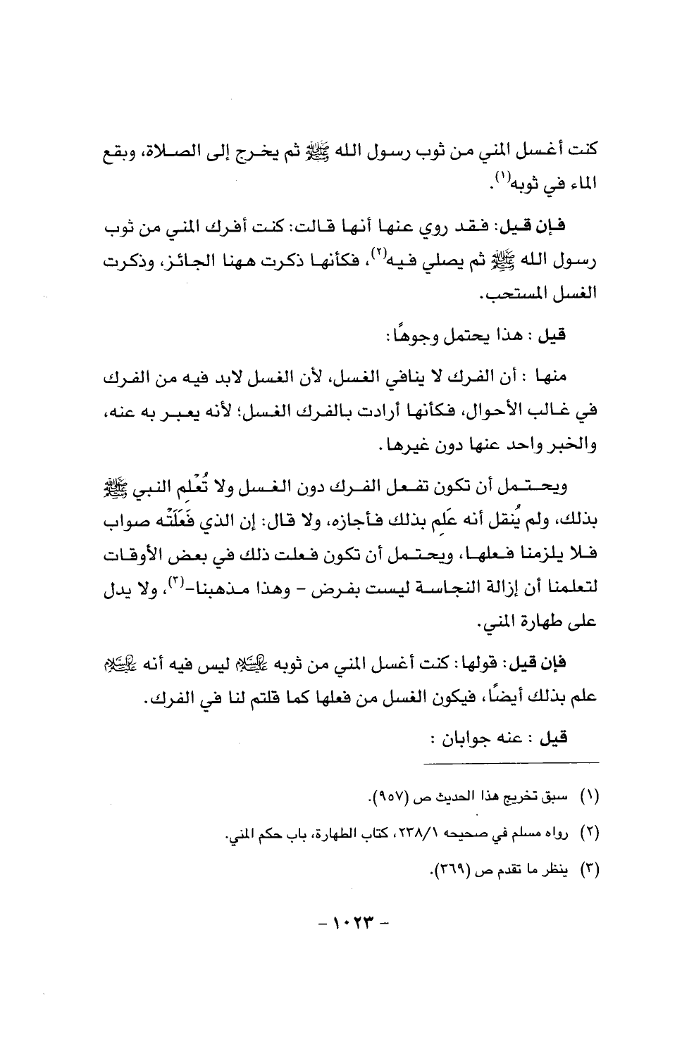 ويحتمل أن تكون تفعل الفرك دون الغسل ولا تعلم النبي صَلَّى اللَّهُ عَلَيْهِ وَسَلَّمَ بذلك ولم ينقل أنه علم بذلك فأجازه، ولا قال: إن الذي فعلته صواب فلا يلزمنا فعلها، ويحتمل أن تكون فعلت ذلك في بعض الأوقات لتعلمنا أن إزالة النجاسة ليست بفرض - وهذا مذهبنا -، ولا يدل على طهارة المني.