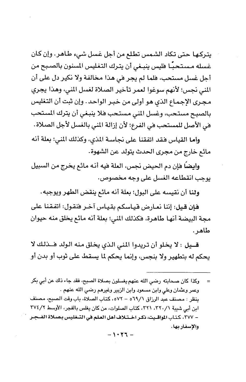 يتركها حتى تكاد الشمس تطلع من أجل غسل شيء طاهر. وإن كان غسله مستحبا فليس ينبغي أن يترك التغليس المسنون بالصبح من أجل غسل مستحب، فلما لم يجر في هذا مخالفة ولا نكير دل على أن المني نجس؛ لأنهم سوغوا لعمر تأخير الصلاة لغسل المني، وهذا يجري مجرى الإجماع الذي هو أولى من خبر الواحد. وإن ثبت أن يترك المستحب في الأصل للمستحب في الفرع؛ لأن إزالة المني بالغسل لأجل الصلاة.