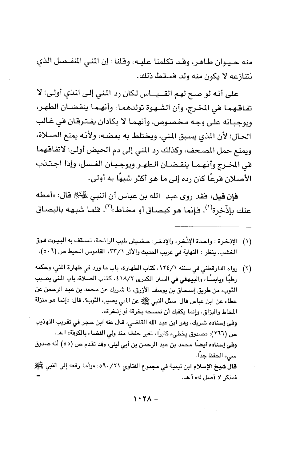 على أنه لو صح لهم القياس لكان رد المني إلى المذي أولى؛ لاتفاقهما في المخرج، وأن الشهوة تولدهمها، وأنهما ينقضان الطهر، ويوجبانه على وجه مخصوص، وأنهما لا يكادان يفترقان في غالب الحال، لأن المذي يسبق المني، ويختلط به بعضه، ولأنه يمنع الصلاة، ويمنع حمل المصحف، وكذلك رد المني إلى دم الحيض أولى؛ لاتفاقهما في المخرج وأنهما ينقضان الطهر ويوجبان الغسل، وإذا اجتذبت الأصلانفرعا كان رده إلى ما هو أكطثر شبها به أولى.