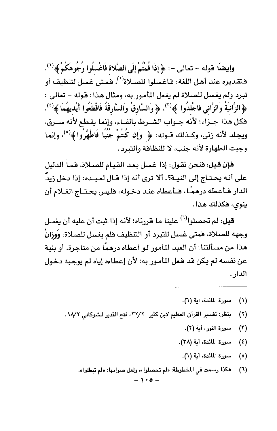 وأيضاً قوله - تعالى -: {إِذَا قُمْتُمْ إِلَى الصَّلَاةِ فَاغْسِلُوا وُجُوهَكُمْ}، فتقديره عند أهل اللغة: فاغسلوا للصلاة، فمتى غسل لتنظيف أو تبرد ولم يغسل للصلاة لم يفعل المأمور به، ومثال هذا: قوله -تعالى -: {الزَّانِيَةُ وَالزَّانِي فَاجْلِدُوا}، {وَالسَّارِقُ وَالسَّارِقَةُ فَاقْطَعُوا أَيْدِيَهُمَا}، فكل هذا جزاء؛ لأنَّه جواب الشرط بالفاء، وإنَّما يقطع لأنه سرق، ويجلد لأنه زنى، وكذلك قوله: {وإن كُنْتُمْ جُنُبًا فَاطَّهَّرُوا}، وإنَّما وجبت الطهارة لنه جنب، لا للنظافة والتبرد.