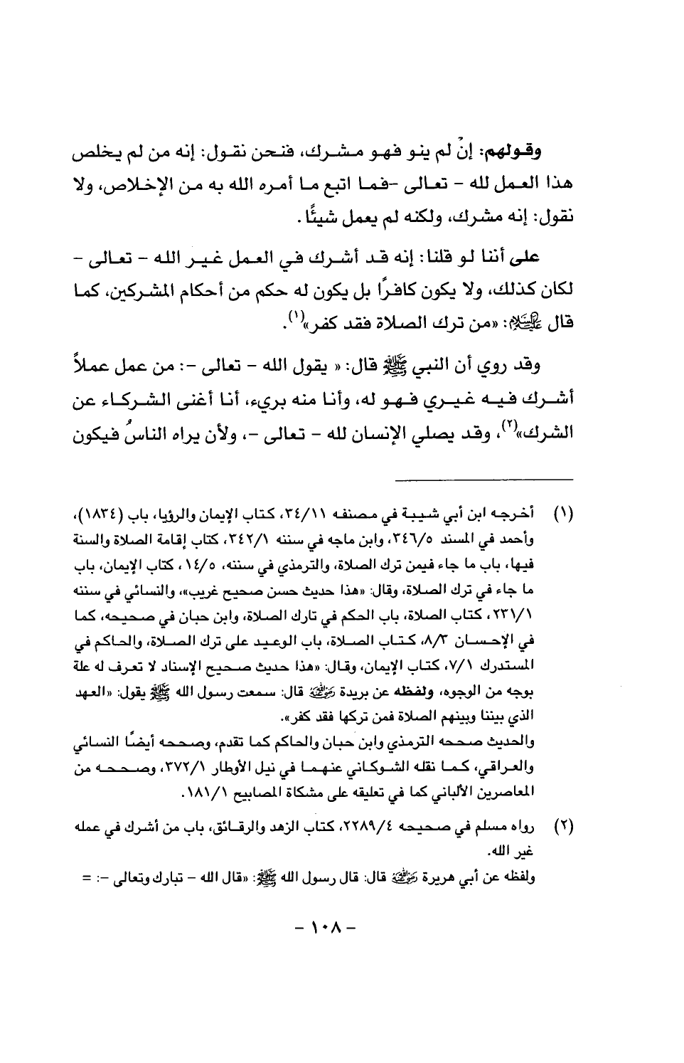وقولهم: إن لم ينو فهو مشرك، فنحن نقول: إنَّه من لم يخلص هذا العمل له -تعالى - فما اتبع ما أمره الله به من الإخلاص، ولا نقول: إنه مشرك، ولكنه لم يعمل شيئاً.
