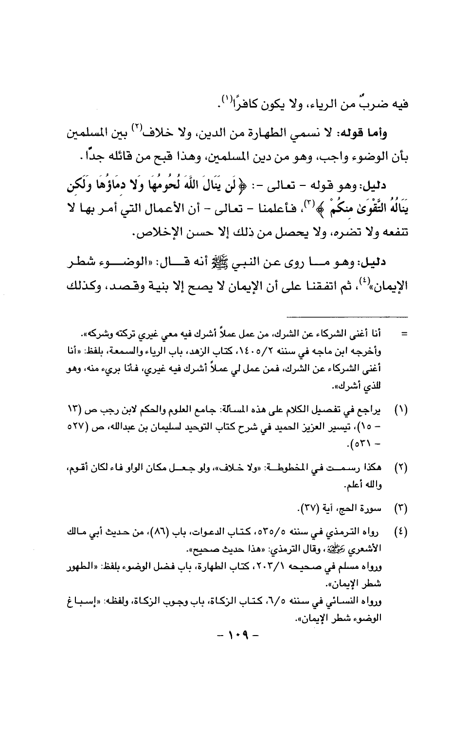 دليل: وهو قوله -تعالى - {لَنْ يَنَالَ اللَّهَ لُحُومُهَا ولا دِمَاؤُهَا وَلَكِنْ يَنَالُهُ التَّقْوَى مِنْكُمْ}، فأعلمنا - تعالى - أن الأعمال التي أمر بها لا تنفعه ولا تضره، ولا يحصل من ذلك إلا حسن الإخلاص.