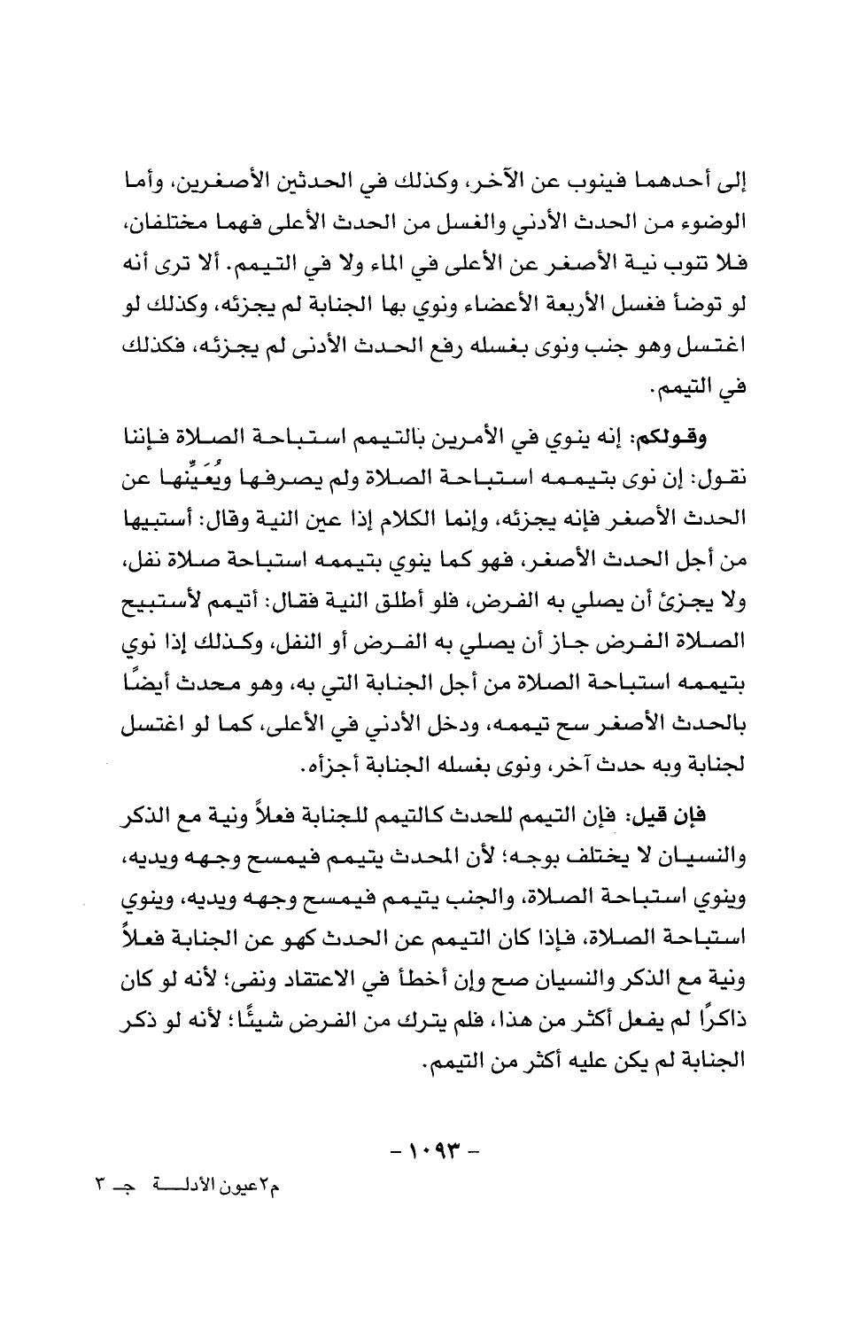 وقولكم: إنه ينوي في الأمرين بالتيمم استباحة الصلاة فإننا نقول: إن نوى بتيممه استباحة الصلاة ولم يصرفاه ويعينا عن الحدث الأصغر فإنه يجزئه، وإنما الكلام إذا عين النية وقال: أستبيها من أجل الحدث الأصغر، فهو كما ينوي بتيممه استباحة صلاة نفل، ولا يجزئ أن يصلي به الفرض، فلو أطلق النية فقال: أتيمم لأستبيح الصلاة الفرض جاز أن يصلي به الفرض أو النفل، وكذلك إذا نوى بتيممه استباحة الصلاة من أجل الجنابة التي به، وهو محدث أيضا بالحدث الأصغر سحنون تيممه، ودخل الأدنى في الأعلى، كما لو اغتسل لجنابة وبه حدث آخر، ونوى بغسله الجنابة أجزأه.