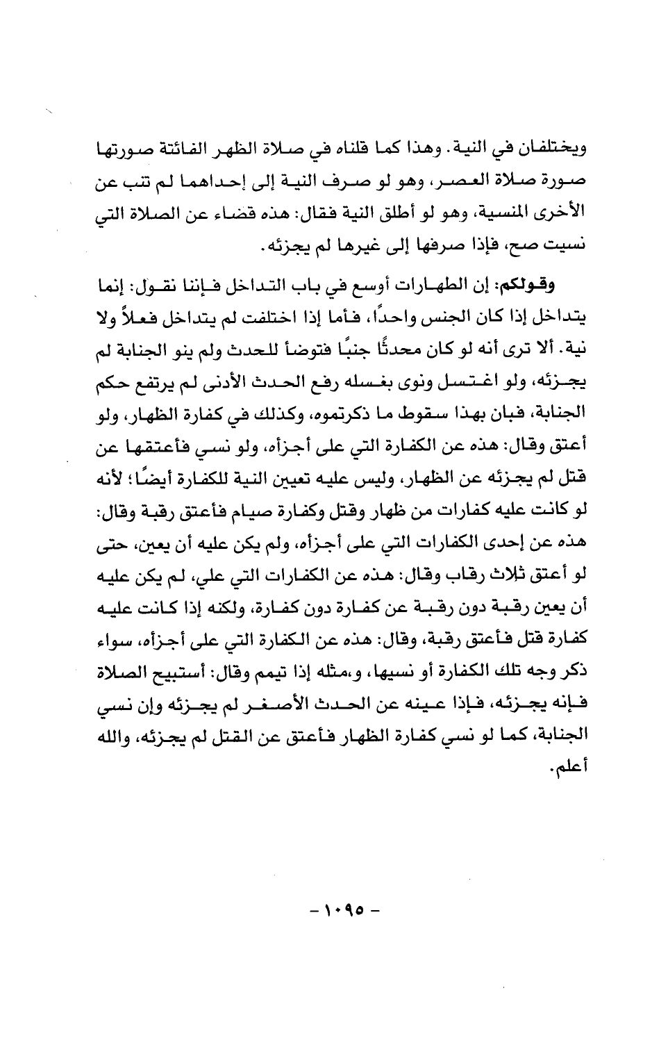 وقولكم: إن الطهارات أوسع في باب التداخل فإننا نقول: إنما يتداخل ... إذا كان الجنس واحدا، فأما اختلفت لم يتداخل فعلا ولا نية. ألا ترى أنه لو كان محدثا جنبا فتوضأ للحدث ولم ينو الجنابة لم يجزئه، ولو اغتسل ونوى بغسله رفع الحدث الأدنى لم يرتفع حكم الجنابة، فبان بهذا سقوط ما ذكرتموه، وكذ ... لك في كفارة الظهار، ولو أعتق وقال: هذه عن الكفارة التي على أجزأه، ولو نسي فأعتقها عن قتل لم يجزئه عن الظهار، وليس عليه تعيين النية للكفارة أيضا؛ لأنه لو كانت عليه كفارات من ظهار وقتل وكفارة صيام فأعتق رقبة وقال: هذه على إحدى الكفارات التي على أجزأه، ولم يكن عليه أن يعين، حتى لو أعتق ثلاث رقاب وقال: هذه عن الكفارات التي علي، لم يكن عليه أن يعين رقبة دون رقبة عن كفارة دون كفارة، ولكنه إذا كانت عليه كفارة قتل فأعتق رقبة، وقال: هذه عن الكفارة التي على أجزأه، سوءا ذكر وجه تلك الكفارة أو نسيها، ومثله إذا تيمم وقال: أستبيح الصلاة فإنه يجزئه، فإذا عينه عن الحدث الأصغر لم يجزئه وإن نشي الجنابة، كما لو نسي كفارة الظهار فأعتق عن القتل لم يجزئه، والله أعلم