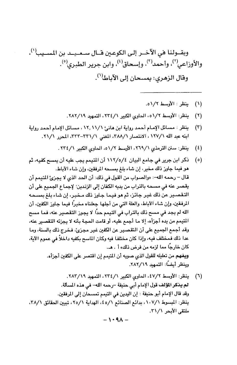 وبقولنا في الآخر إلى الكوعين قال سعيد بن المسيب، والأوزاعي، وأحمد، وإسحاق، وابن جرير الطبري.