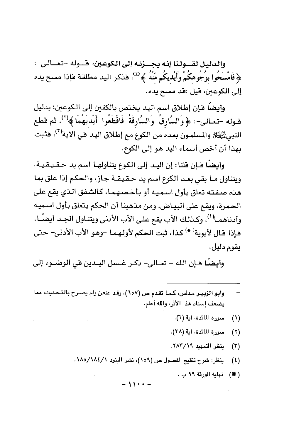 وأيضا فإن إطلاق اسم اليد يختص بالكفين إلى الكوعين؛ بدليل قوله - تعالى -: {والسارق والسارقة فاقطعوا أيديهما}، ثم قطع النبي عليه السلام والمسلمون بعده من الكوع مع إطلاق اليد في الآية، فثبت بهذا أخص أسماء اليد هو إلى الكوع.