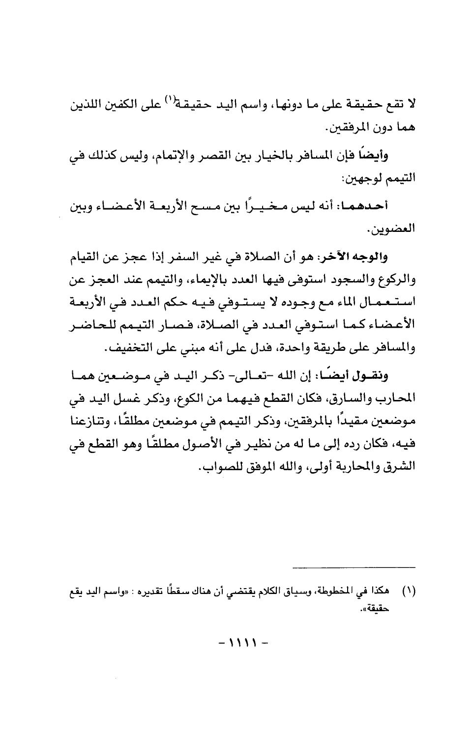 ونقول أيضا: إن الله - تعالى - ذكر اليد في موضعين هما المحارب والسارق، فكان القطع فيهما من الركوع، وذكر غسل اليد في موضعين مقيدا بالمرفقين، ذكر التيمم في موضعين مطلقا، وتنازعنا فيه، فكان رده إلى ما له من نظير مطلقا وهو القطع في الشرق والمحاربة أولى، والله الموفق للصواب.