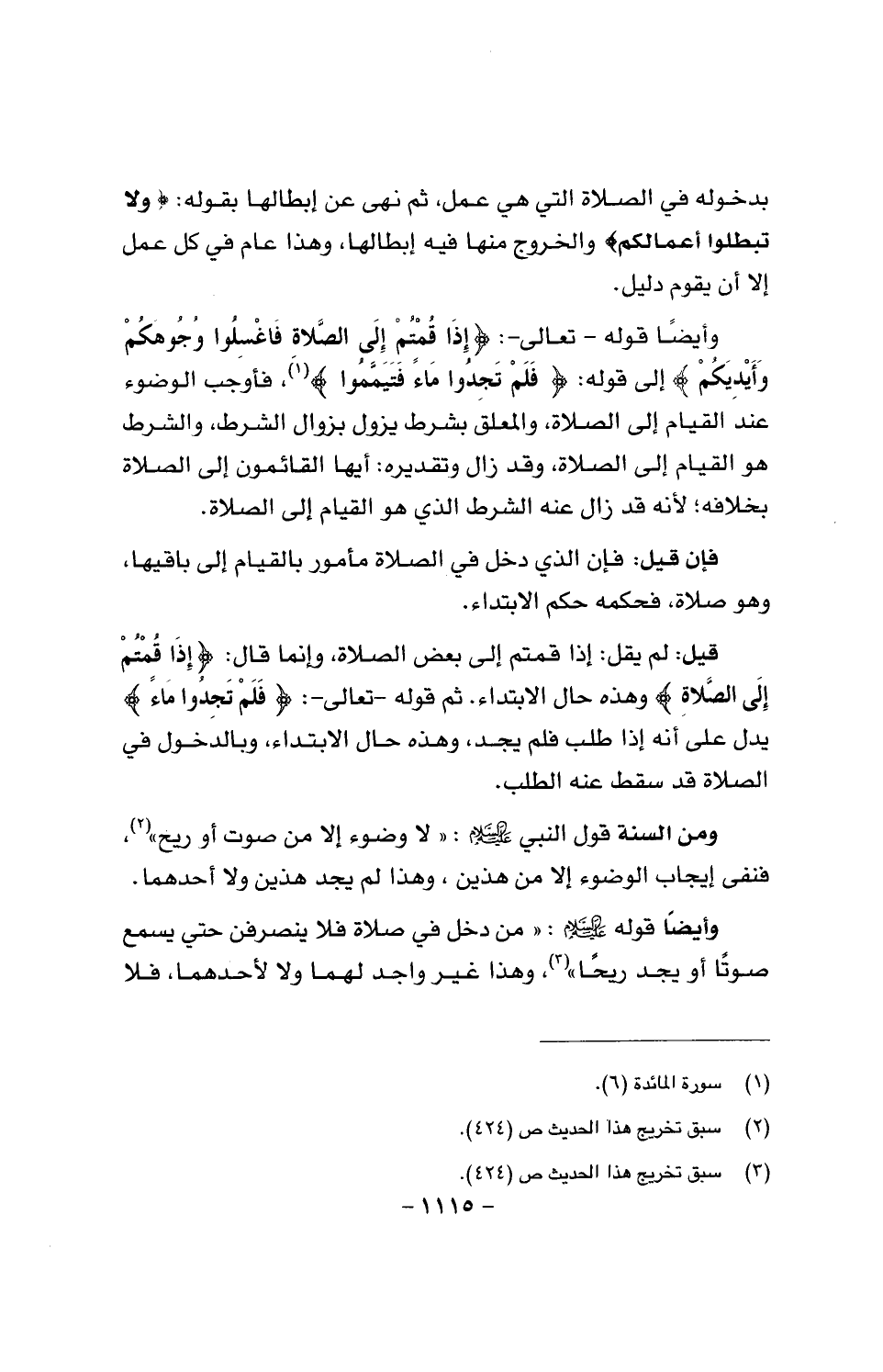 وأيضا قوله - تعالى -: {إذا قمتم إلى الصلاة فاغسلوا وجوهكم أيديكم} إلى قوله: {فلم تجدوا ماء فتيمموا}، فأوجب الوضوء عند القيام إلى الصلاة، والمعلق بشرط يزول بزوال الشرط، والشرط هو القيام إلى الصلاة، وقد زال وتقديره: أيها القائمون إلى الصلاة بخلافه؛ لأنه قد زال عنه الشرط الذي هو القيام إلى الصلة.