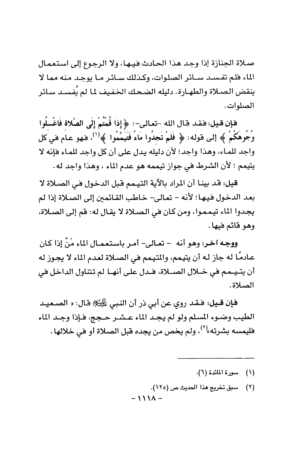 ووجه آخر: وهو أنه - تعالى - أمر باستعمال الماء من إذا كان عادما له جاز له أن يتيمم، والمتيمم في الصلاة لعدم الماء لا يجوز له أن يتيمم في خلال الصلاة، فدل على إنها لم تتناول الداخل في الصلاة.