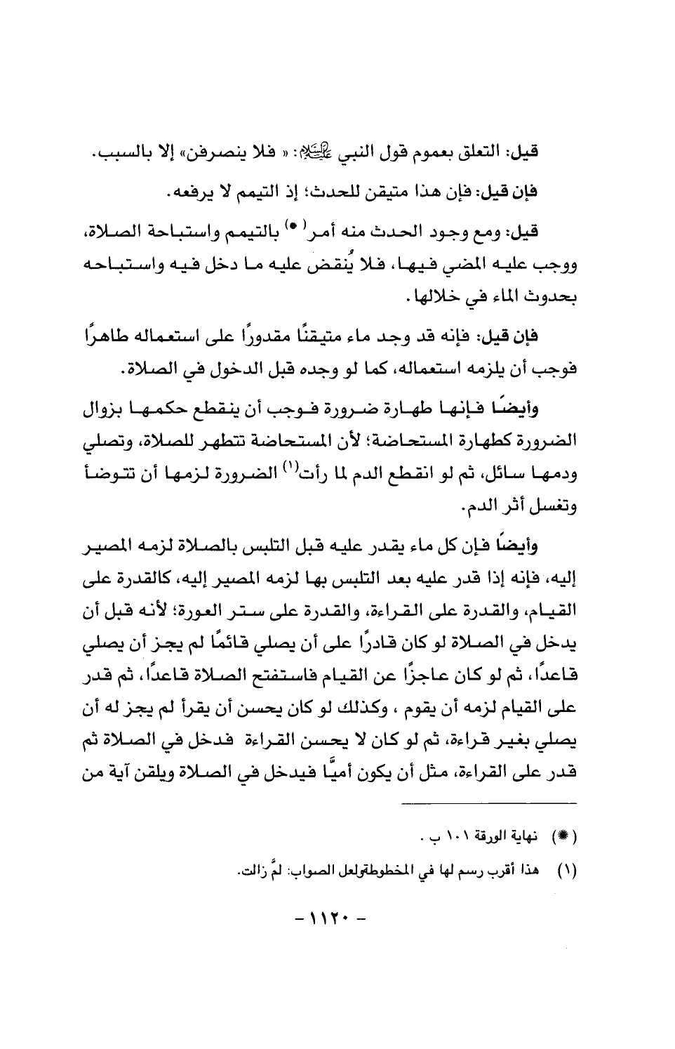 وأيضا فإن كان ماء بقدر عليه قبل التلبس بالصلاة لزمه المصير إليه، فإنه إذا قدر عليه بعد التلبس بها لزمه المصير إليه، كالقدرة على القيام، والقدرة على القراءة، والقدرة على ستر العورة؛ لأنه قبل أن يدخل في الصلاة لو كان قادرا على أن يصلي قائما لم يجز أن يصلي قاعدا، ثم لو كان عاجزا عن القيام فاستفتح الصلاة قاعدا، ثم قدر على القيام لزمه أن يقوم، وكذلك لو كان يحسن أن يقرأ لم يجز له أن يصلي بغير قراءة ثم لو كان لا يحسن القراءة فدخل في الصلاة ثم قدر على القراءة، مثل أن يكون أميا فيدخل في الصلاة ويلقن آية من