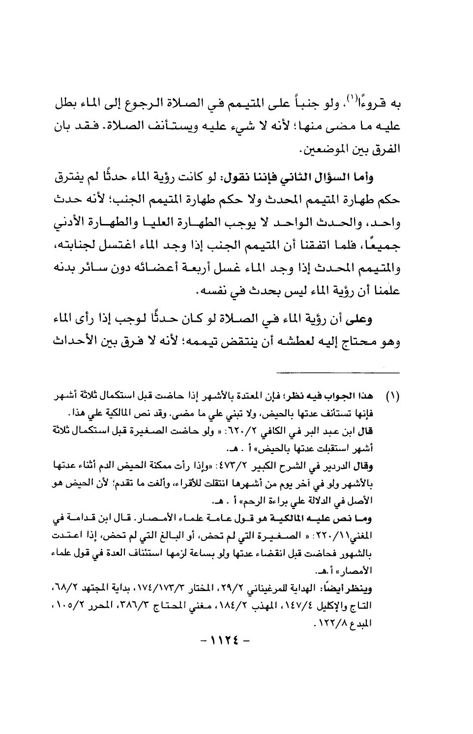 وأما السؤال الثاني فإننا نقول: لو كانت رؤية الماء حدثا لم يفترق حكم طهارة المتيمم المحدث ولا حكم الطهارة الميمم الجنب؛ لأنه حدث واحد، والحدث الواحد لا يوجب الطهارة العليا والطهارة الأدنى جميعا، فلما اتقنا أن المتيمم الجنب إذا وجد الماء اغتسل لجنابته، والمتيمم المحدث إذا ... وجد الماء غسل أربعة أعضائه دون سائر بدنه علمنا أن رؤية الماء ليس بحدث في نفسه.