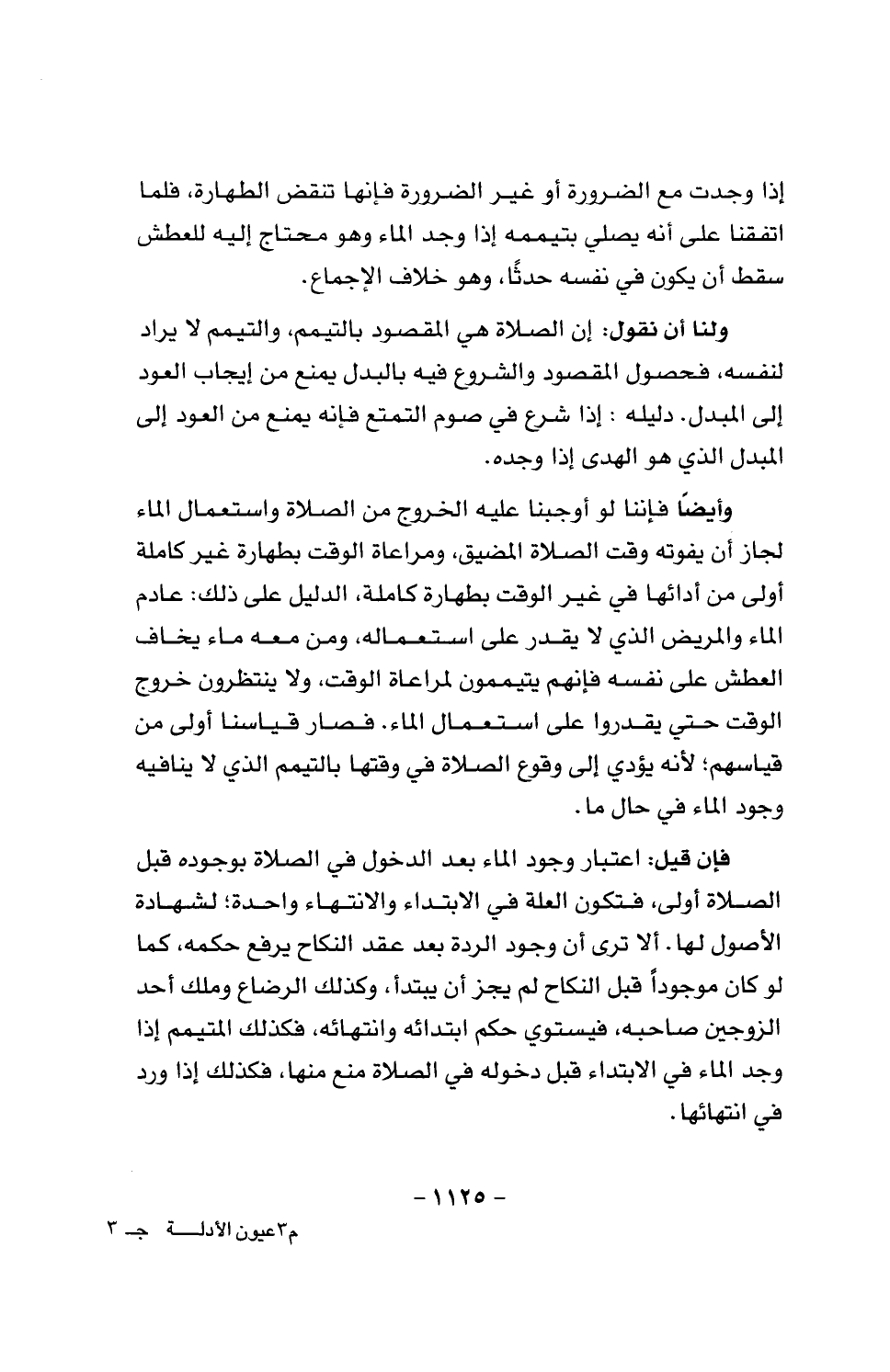 فإن قيل: اعتبار وجود الماء بعد الدخول في الصلاة بوجوده قبل الصلاة أولى، فتكون العلة في الابتداء والانتهاء واحدة؛ لشهادة الأصول لها. ألا ترى أن وجود الردة بعد عقد النكاح يرفع حكمه، كما لو كان موجودا قبل النكاح لم يجز أن يبتدأ، وكذلك الرضاع وملك أحد الزوجين صاحبه، فيستوي حك ابتدائه وانتهائه، فكذلك المتيمم إذا وجد الماء في الابتداء قبل دخوله في الصلاة منع منه، فكذلك مذ ورد في انتهائها.
