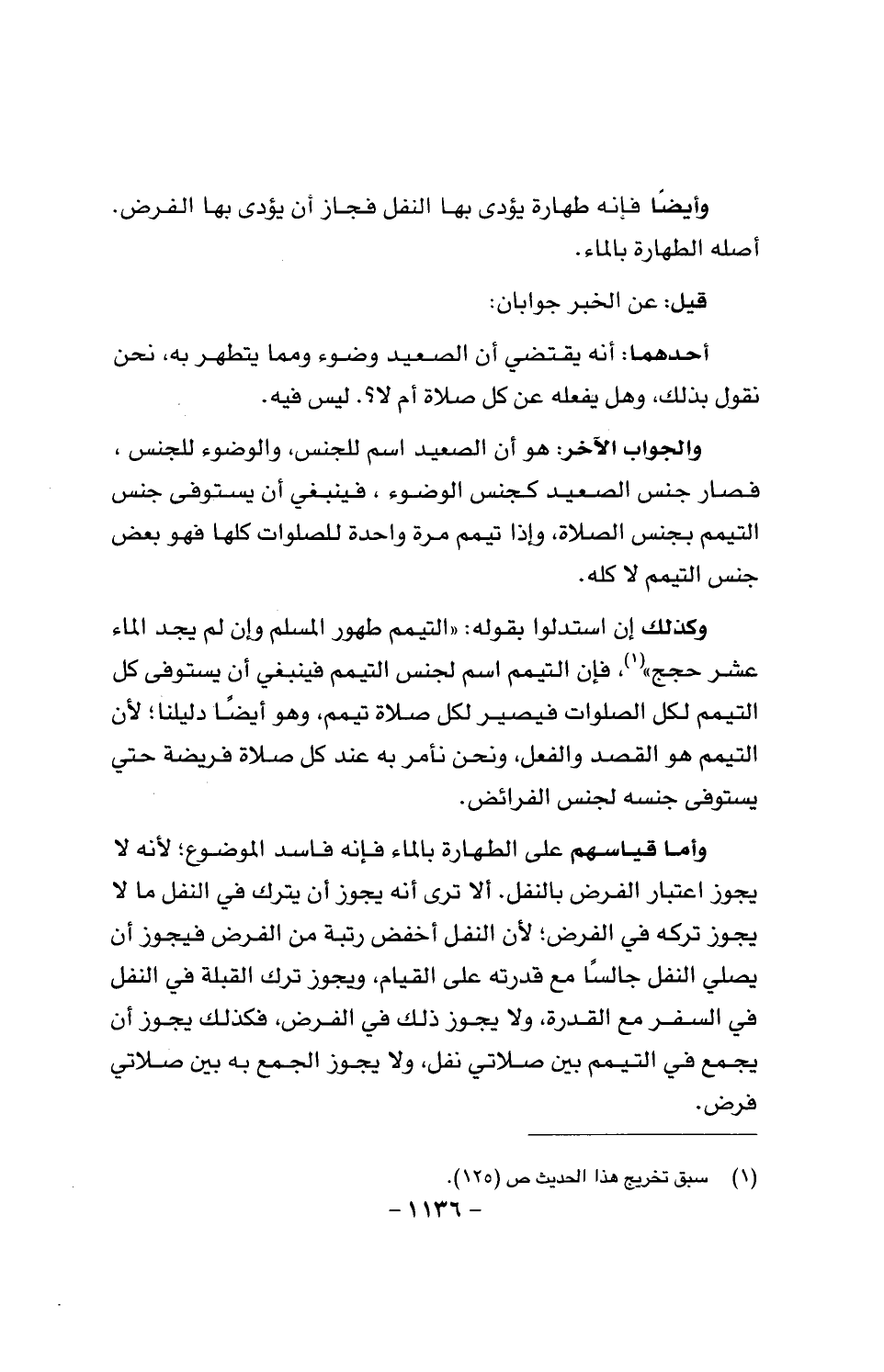 وكذلك إن استدلوا بقوله: «التيمم طهور المسلم وغم لم يجد الماء عشر حجج»، فإن التيمم اسم لجنس التيمم فينبغي أن يستوفي كل التيمم لكل الصلات فيصير لكل صلاة تيمم، وهو أيضا دليلنا؛ لأن التيمم هو القصد والفعل، ونحن نأمر به عند كل صلاة فريضة حتى يستوفى جنسه لجنس الفرائض.