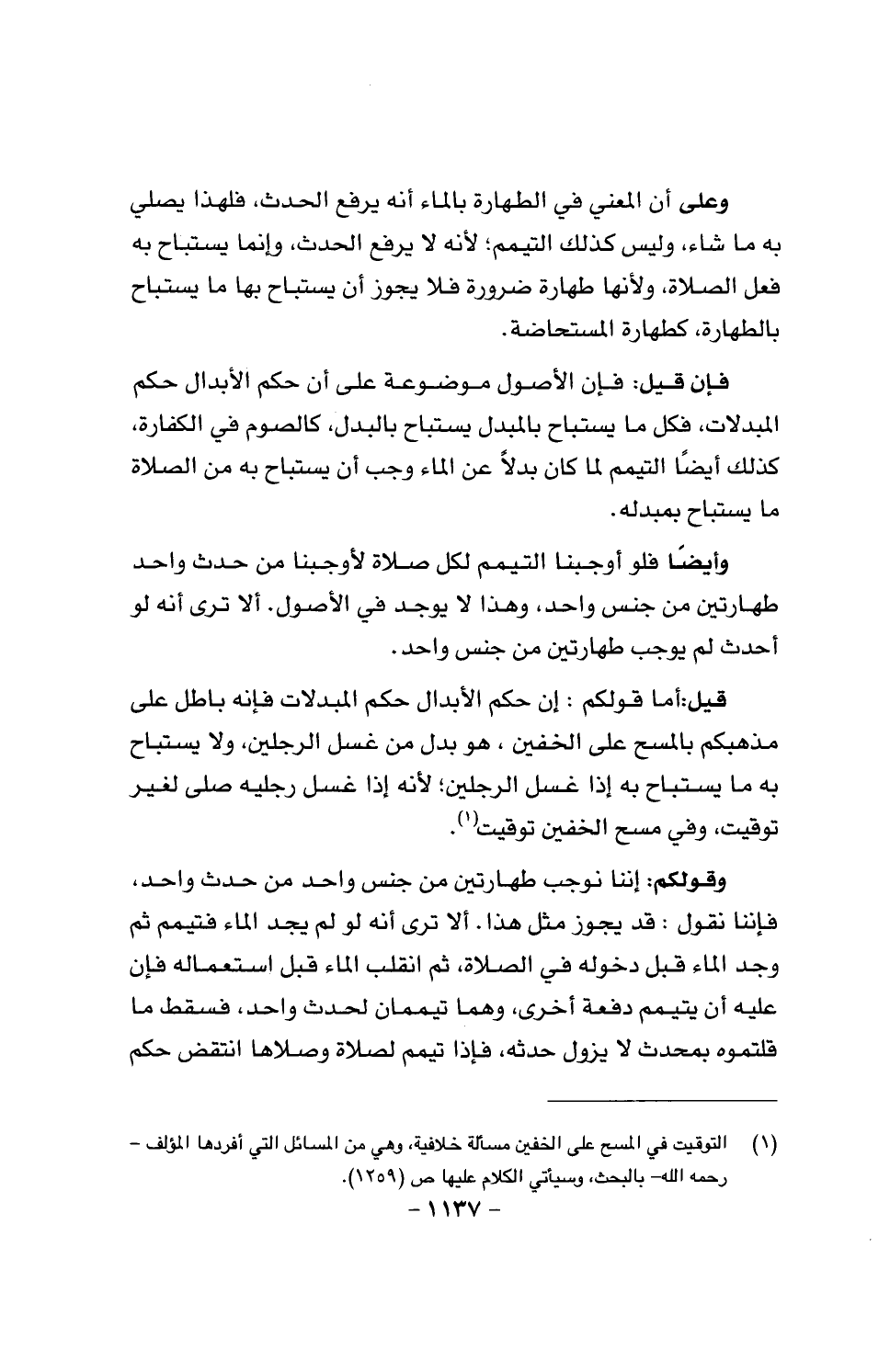 وقولكم: إننا نجب طهارتين من جنس واحد من حدث واحد، فإننا نقول: قد يجوز مثل هذا. ألا ترى أنه ل لم يجد الماء فتيمم ثم وجد الماء قبل دخوله في الصلاة، ثم انقلب الماء قبل استعماله فإن عليه أن يتيمم دفعة أخرى، وهما تيممان لحدث واحد، فسقط ما قلتموه بمحدث لا يزول حدثه، فإذا تيمم لصلاة وصلاها انتقض حكم