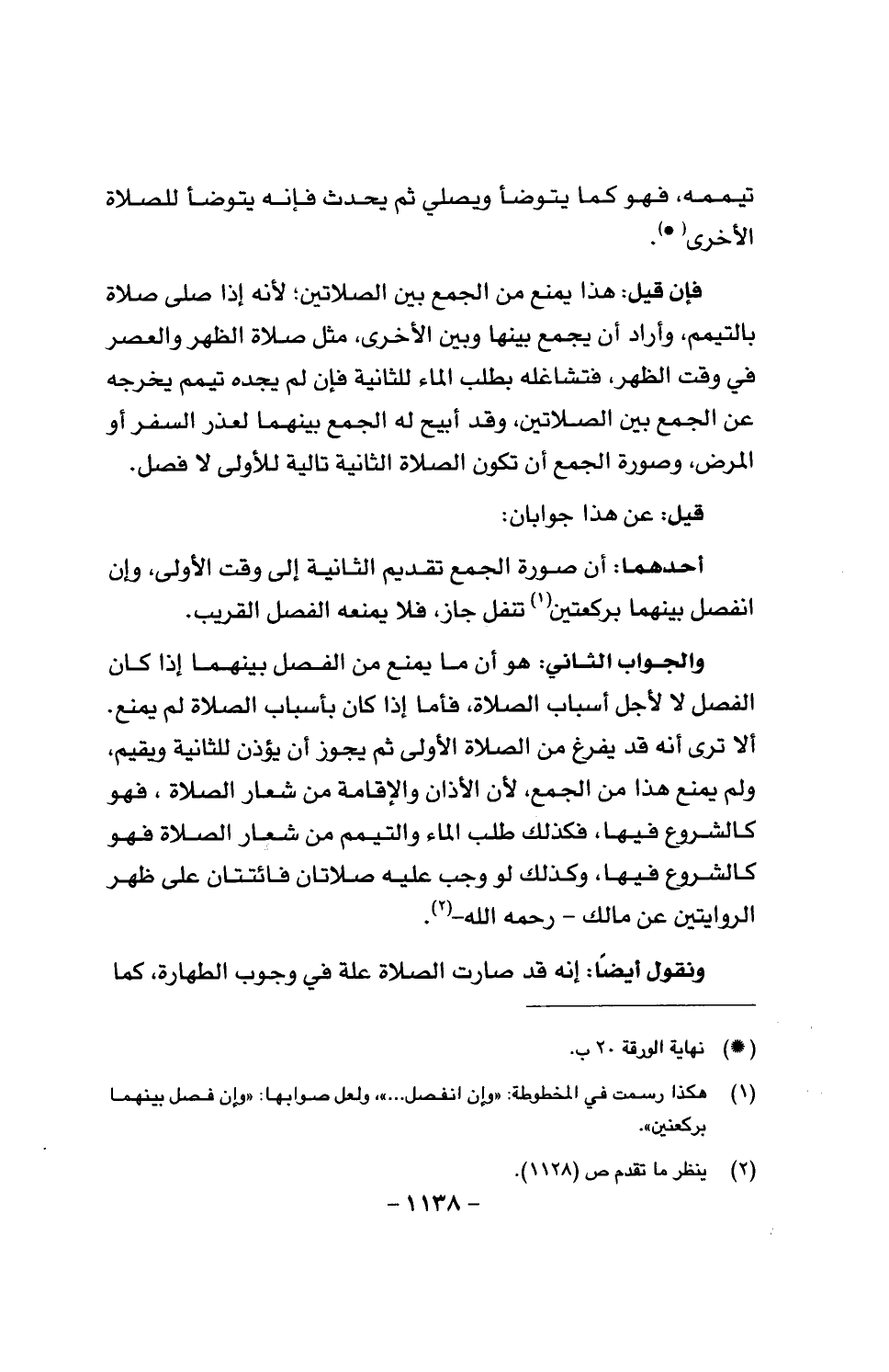 ألا ترى أنه قد يفرغ من الصلاة الأولى ثم يجوز أن يؤذن الثانية ويقيم، ولم يمنع هذا من الجمع، لأن الأذان والإقامة من شعار الصلاة، فهو كالشروع فيها، فكذلك طلب الماء والتيمم من شعار الصلاة فهو كالشروع فيها، وكذلك لو جب عليه صلاتان فائتان على ظهر الروايتين عن مالك - رَحمَه الله -.